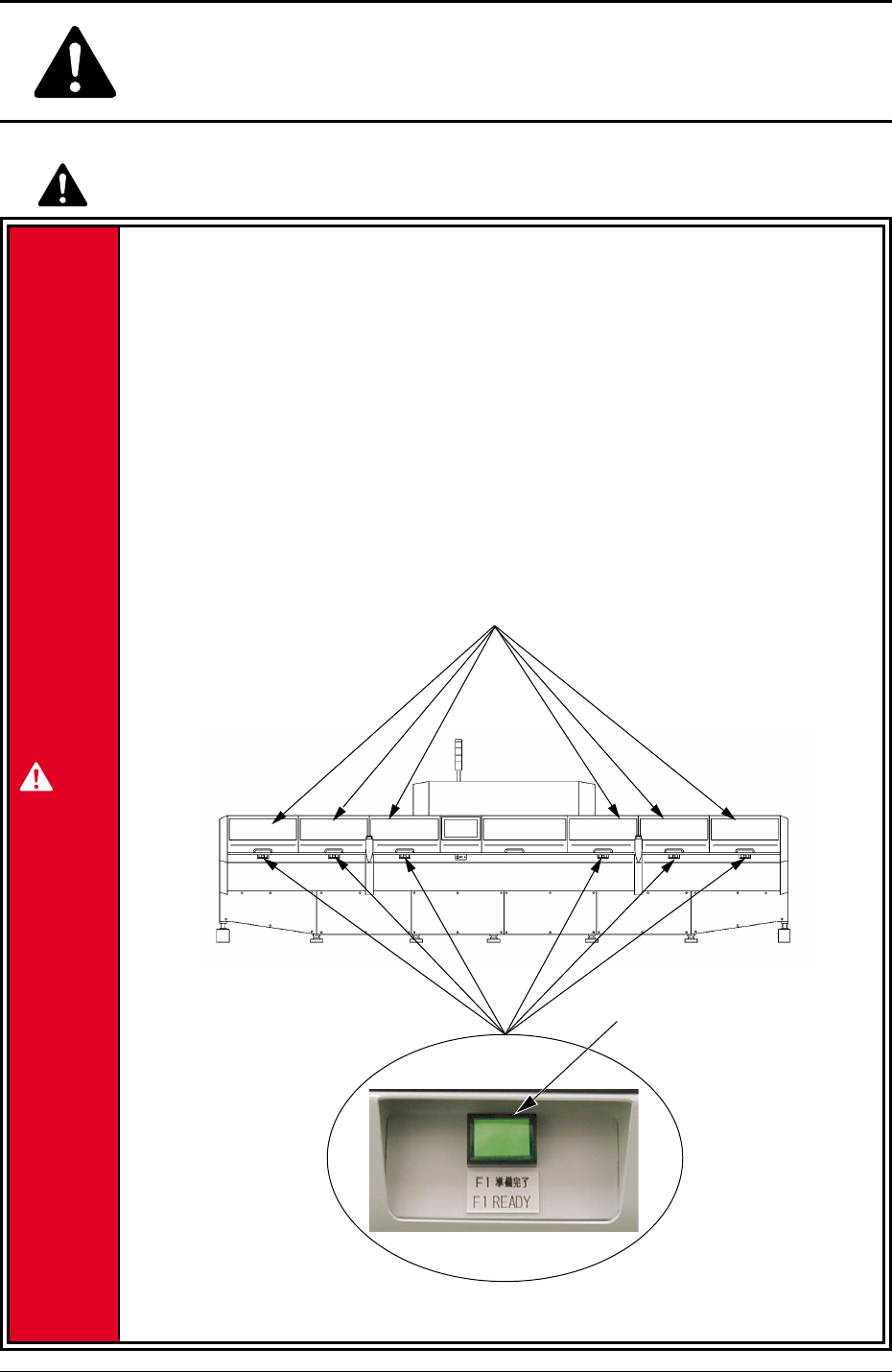 安全 - 10 AHL01J-P 安全にお取扱いいただくために 041 1-001 “フィーダキャリッジ部” 生産運転時の注意 • フィーダキャリッジカバー、フィーダ作業エリア安全扉を開けての生 産運転は、絶対に行わないこと。 フィーダキャリッジに人や物が接触すると、重大な事故となります。 生産運転前には、フィーダキャリッジカバー、フィーダ作業エリア安全扉が 閉まっていることを確認し、開いている場合は、必ず、閉めてください。 Fig. …