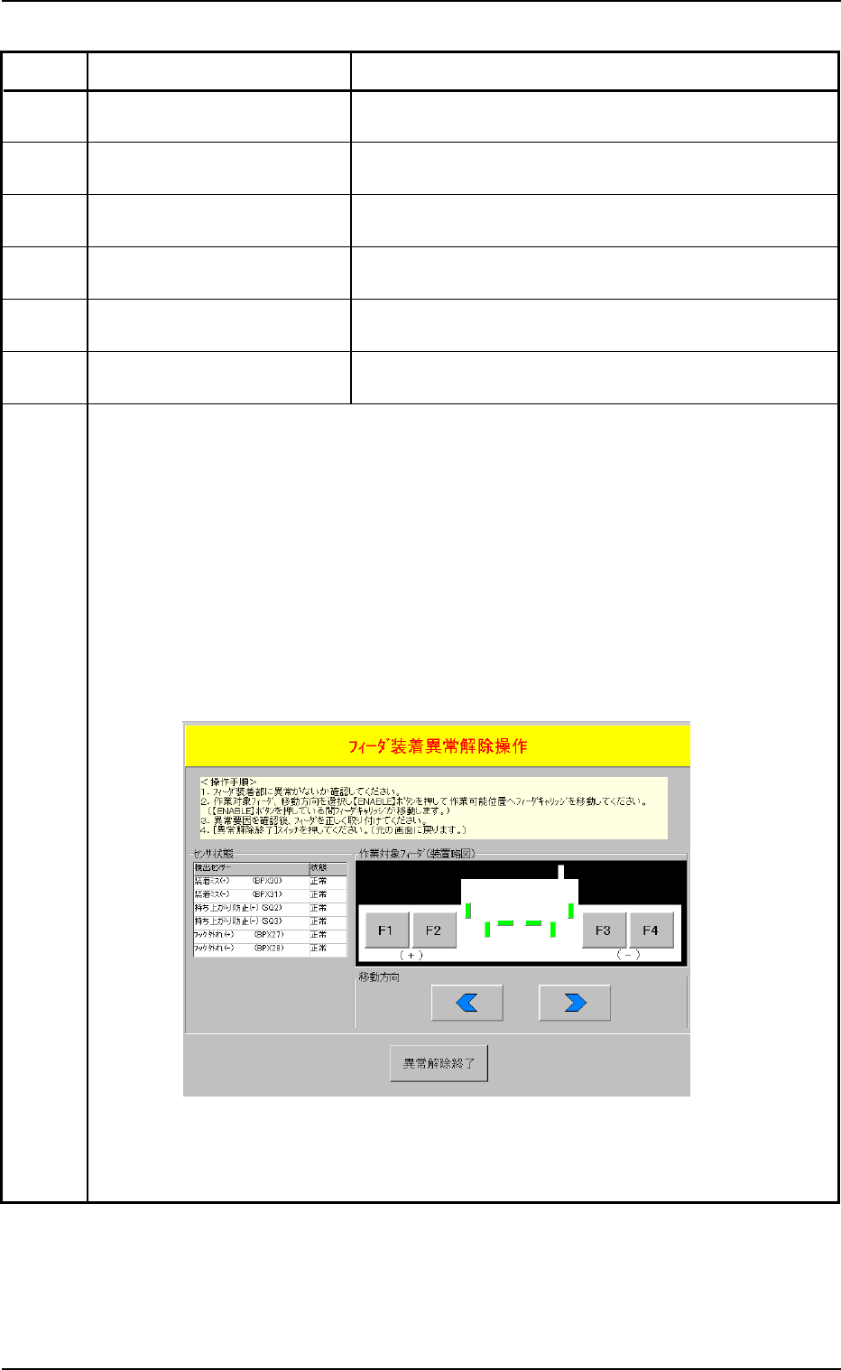 異常 異常 異常 異常 異常 ID ID ID ID ID 異常名 説 明 異常名 説 明 異常名 説 明 異常名 説 明 異常名 説 明 (a) 正しい異常解除をせず、電源を再投入してもフィーダ装着異常の内 容は、バックアップされていますので、再び、フィーダ装着異常が 報知されます。 (b) フィーダ装着異常の解除操作が未完了の状態で、原点復帰操作はで きません。 (1) フィーダ装着部に異常がないか確認してください。 (2) 作業対…