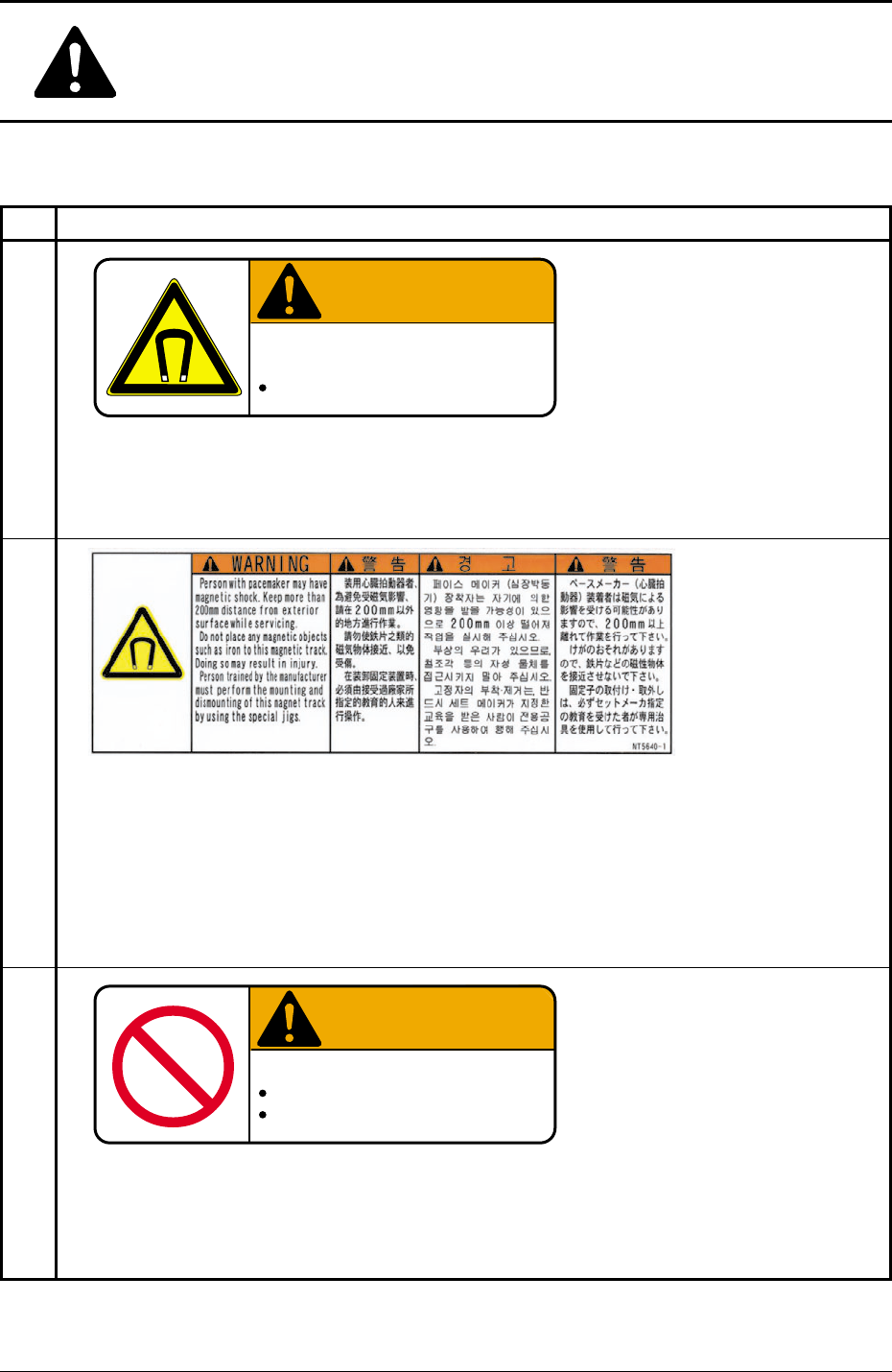 AHL01J-P 安全にお取扱いいただくために 安全 - 31 No. 警告ラベルと説明 *4 説 明 説 明 説 明 説 明 説 明 • ペースメーカー装着者は、装置内で作業しないでください。 ペースメーカーが磁気による異常を受け、重大な事故になるおそれがあります。 *5 説 明 説 明 説 明 説 明 説 明 • ペースメーカー ( 心臓拍動器 ) 装着者は磁気による影響を受ける可能性がありますの で、 200 mm 以上離れて作業…