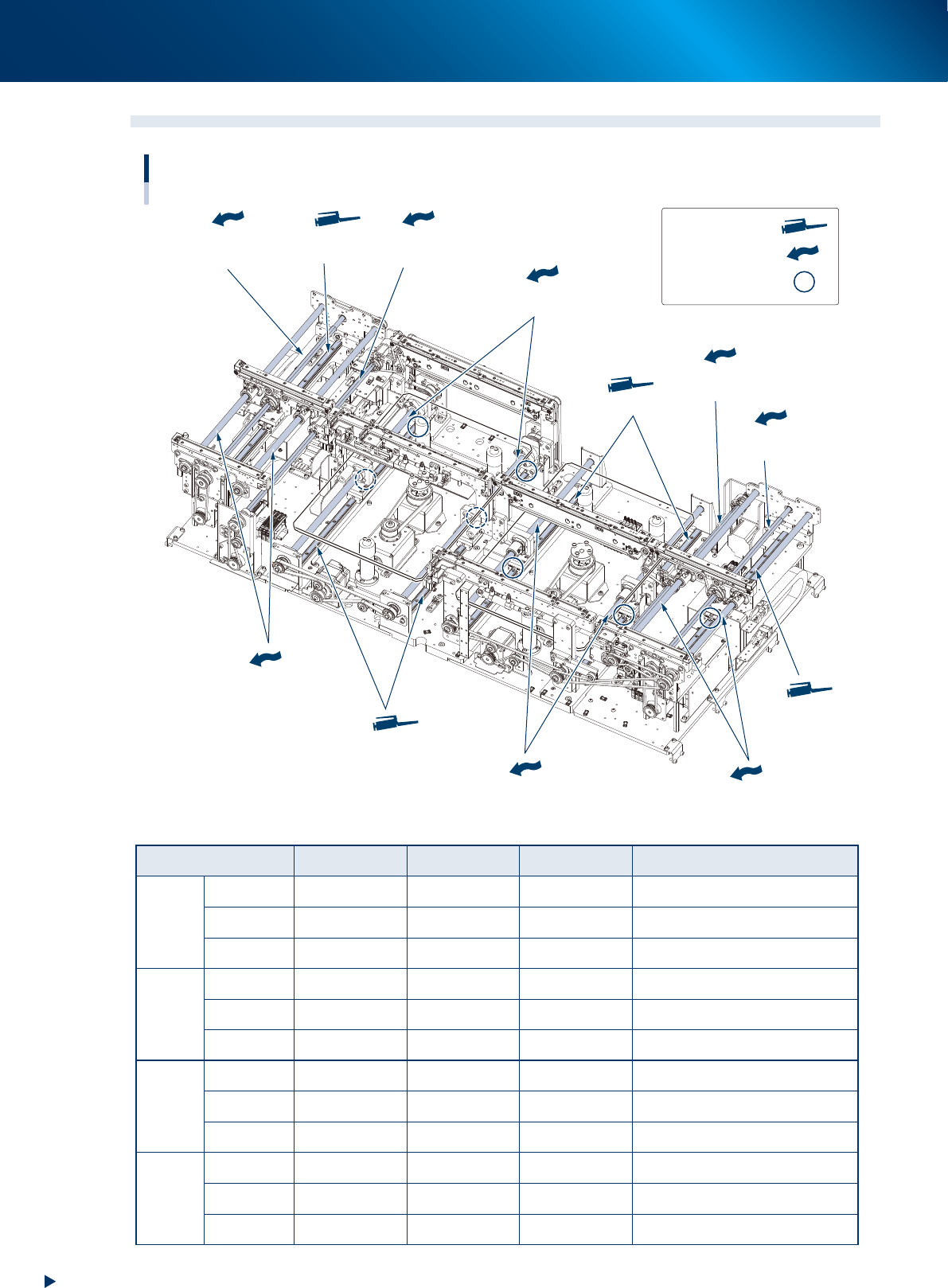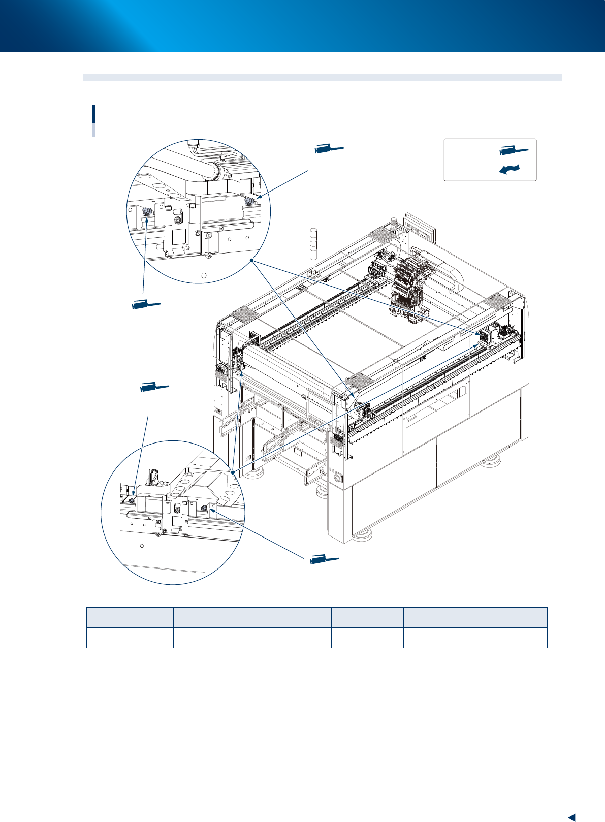 2. 加油位置与加油频率 4-3 第 4 章 加油位置一览 2.2 Y 轴 Y轴的加油位置 润滑油枪 : 用手涂抹 : Y轴导轨部 润滑油注油嘴 Y轴导轨部 润滑油注油嘴 Y轴导轨部 润滑油注油嘴 Y轴导轨部 润滑油注油嘴 55402-KMX-00 加油部位 润滑油种类 加油位置 频率 加油方法 导轨 NSL 4 处 ( 各工作台 ) 1 次/月 润滑油枪 : 标准枪嘴 ( φ 10mm)