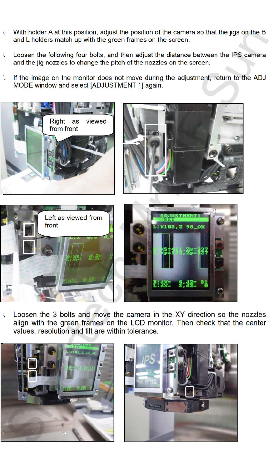 Edition 4.0 H08M(Q) Head Repair T raining T ext FK-9F98-86-0E 5-9 FUJI MACHINE MFG . CO., L TD. 9. Af ter loosening the bolts above, adjust the position of the came ra so that the resolution, center and tilt values are a…