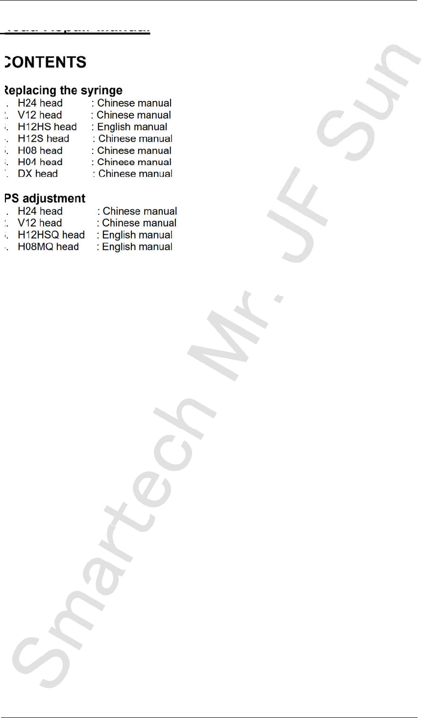 i FUJI MAC HINE MFG. CO., LTD. Head Repair Manual CO NTENTS Replacing the syringe 1. H24 head : Chinese manual 2. V12 head : Chinese manual 3. H12HS head : English manual 4. H12S head : Chinese manual 5. H08 head : Chine…