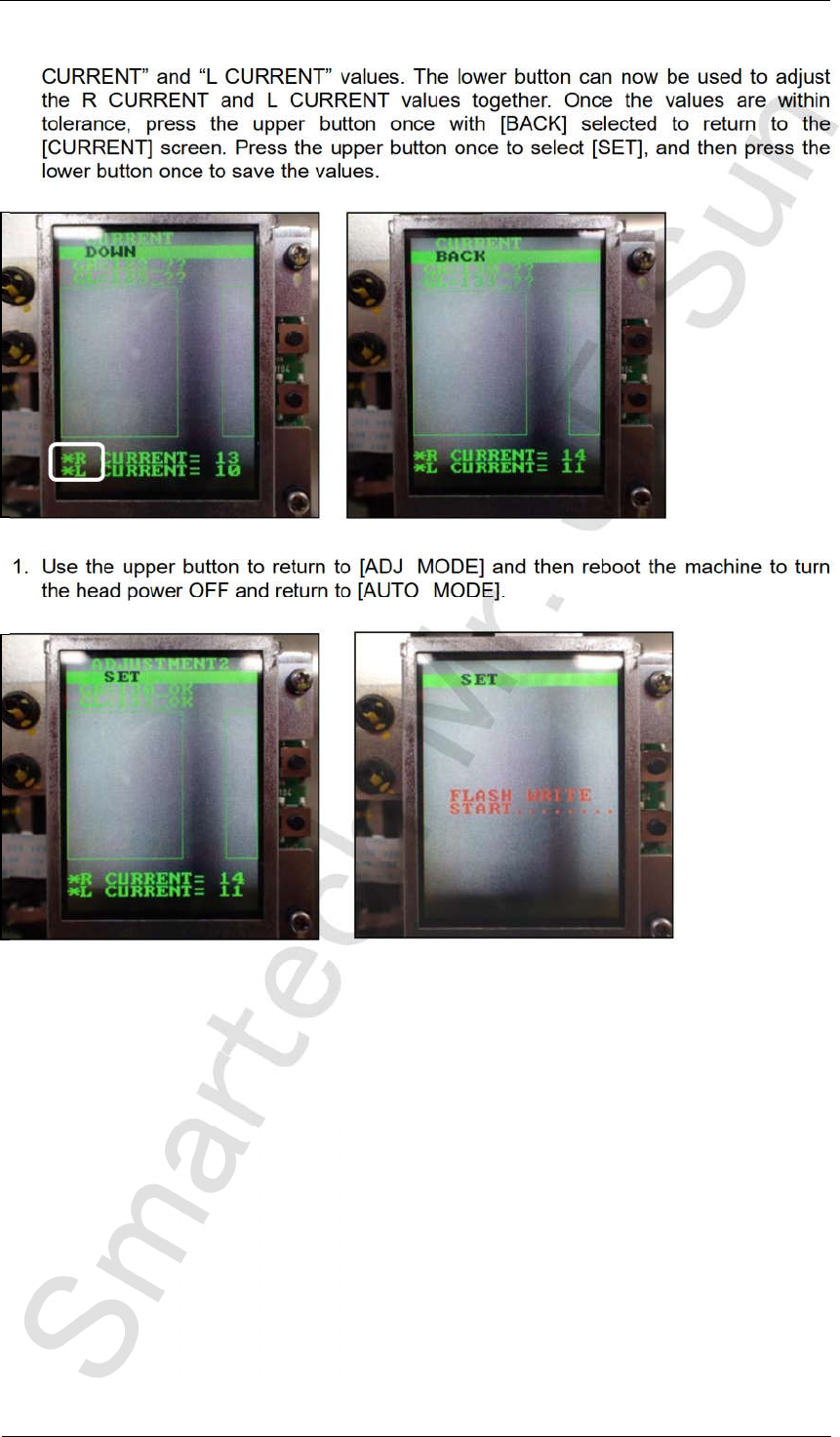 Edition 4.0 H08M(Q) Head Repair T raining T ext FK-9F98-86-0E 5-12 FUJI M ACHINE MFG . CO., L TD . 10. Press and hold the l ower button to display an asterisk mark next to b oth the “R CURRENT” and “L CURRENT” values. T …