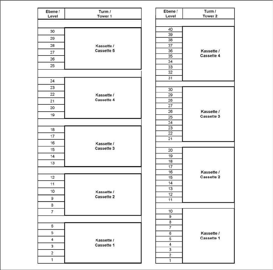 1-2: Nummerierung der Ebenen im Turm 1 und Turm 2