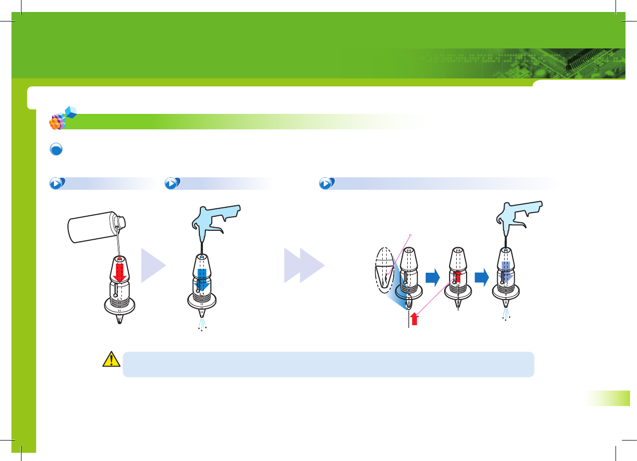 1. 喷射推荐的洗净液 2. 气枪空压喷射 3. 插入内径疏通用别针(清除异物)