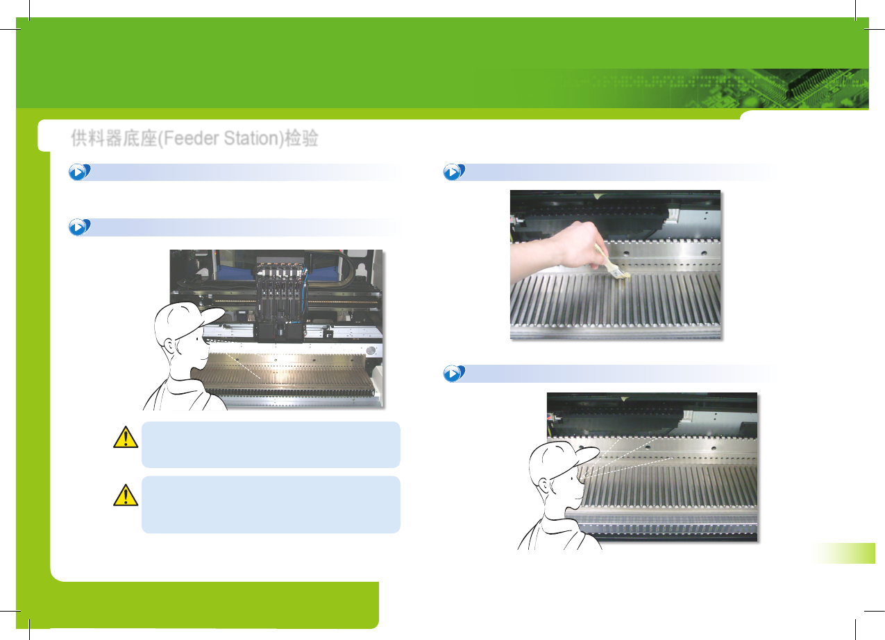 SM 42 1 Ma int en an ce Ha nd bo ok 17 P ART II 日常检验 P ART II. 日常检验 检验 供料器底座 (Feeder Station) 检验 2. 肉眼检验供料器座顶面和固定 Slot 有无污渍 1. 转换成 Motor Free 方式 参照 <Part1> 的 “ 维修前共同执行程序 ” 中 ‘Motor Free’ 部分第5页 4. 肉眼检验供料器座 Slot 的偏磨损…