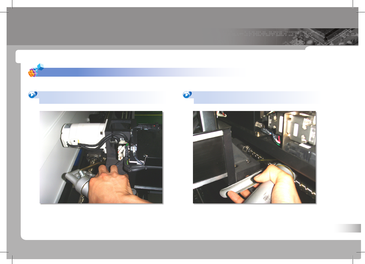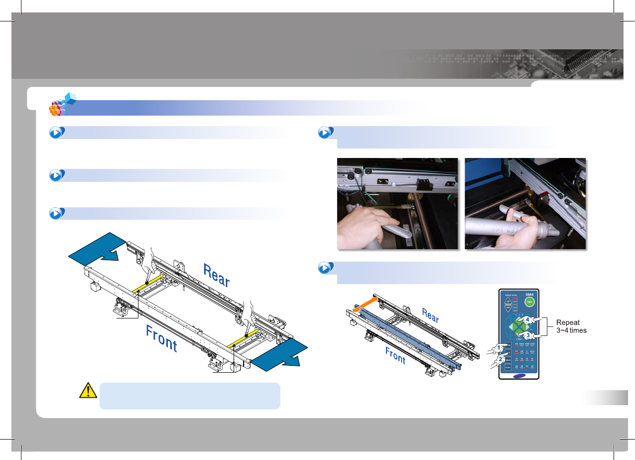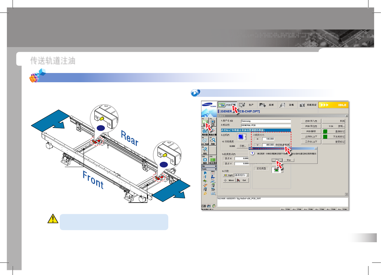 SM 42 1 Ma int en an ce Ha nd bo ok 64 P ART V . 注油及其他检验事项 检验事项 事项 1. 宽度调节用 Lead Screw , LM Guide 注油 传送轨道注油 P C B I N P C B O U T B A Entry LM Guide Exit LM Guide 注油前用干净抹布擦拭灰尘和污渍。 1. 调节传送轨宽度 ① 选择 'PCB 编辑 ' 菜单 ②…