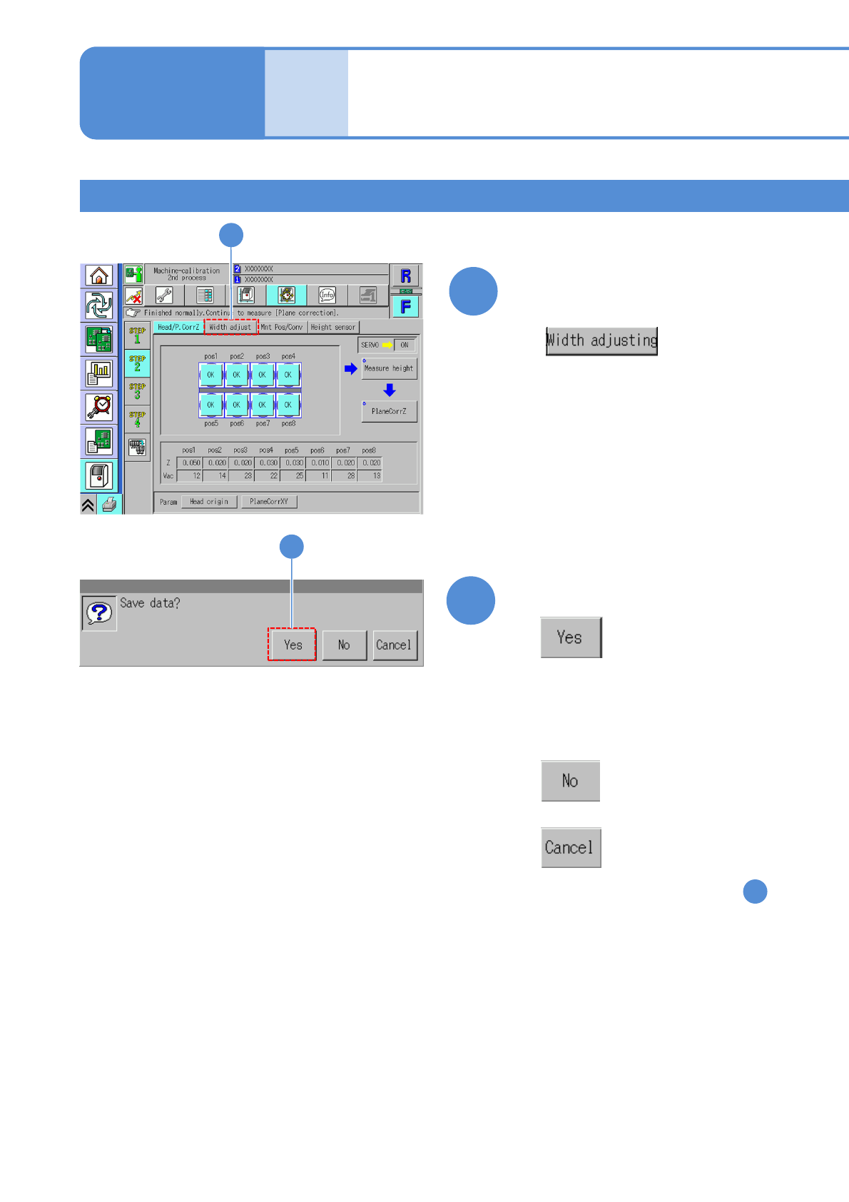 Explains the method for calibrating the width adjustment of the transfer conveyor.