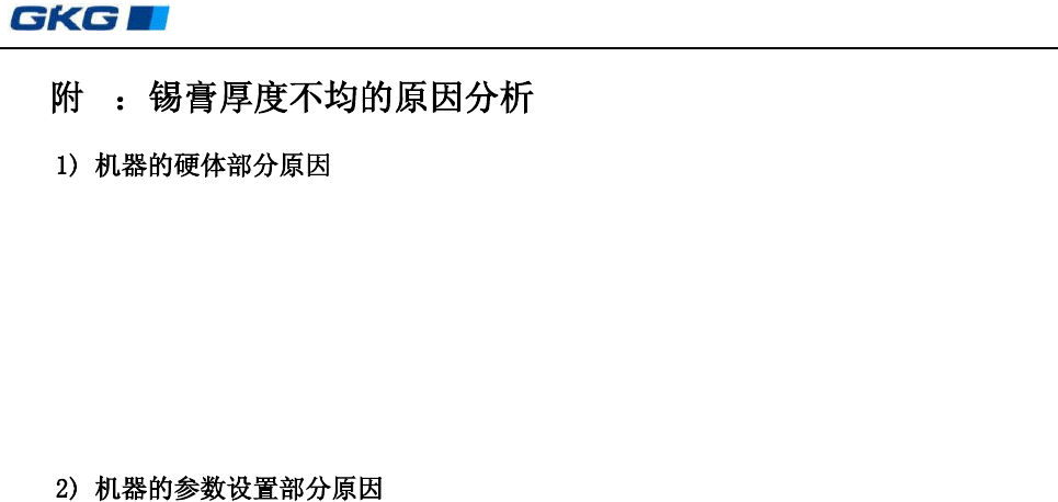 凯格精密机械有限公司 - 31 - 4 a) 升降 平 台是否 干净 :如 果太脏 会引 起表面 不平 。如 有锡 膏洒 在平 台表 面上, 或其 它杂物等。 b) 顶针是否布好、布牢: 正确的方法是顶针布好后用手压在顶针的顶部用手轻晃, 要晃不动才行。 c) 钢网与 PCB 板不平行所致: 如发现不平行则要通知售后服务来校正。 d) PCB 的铜箔是否氧化或不良:要客户生产线上 QC 严把质量关。 a) 刮刀的压力设置:如果太小的压力…
