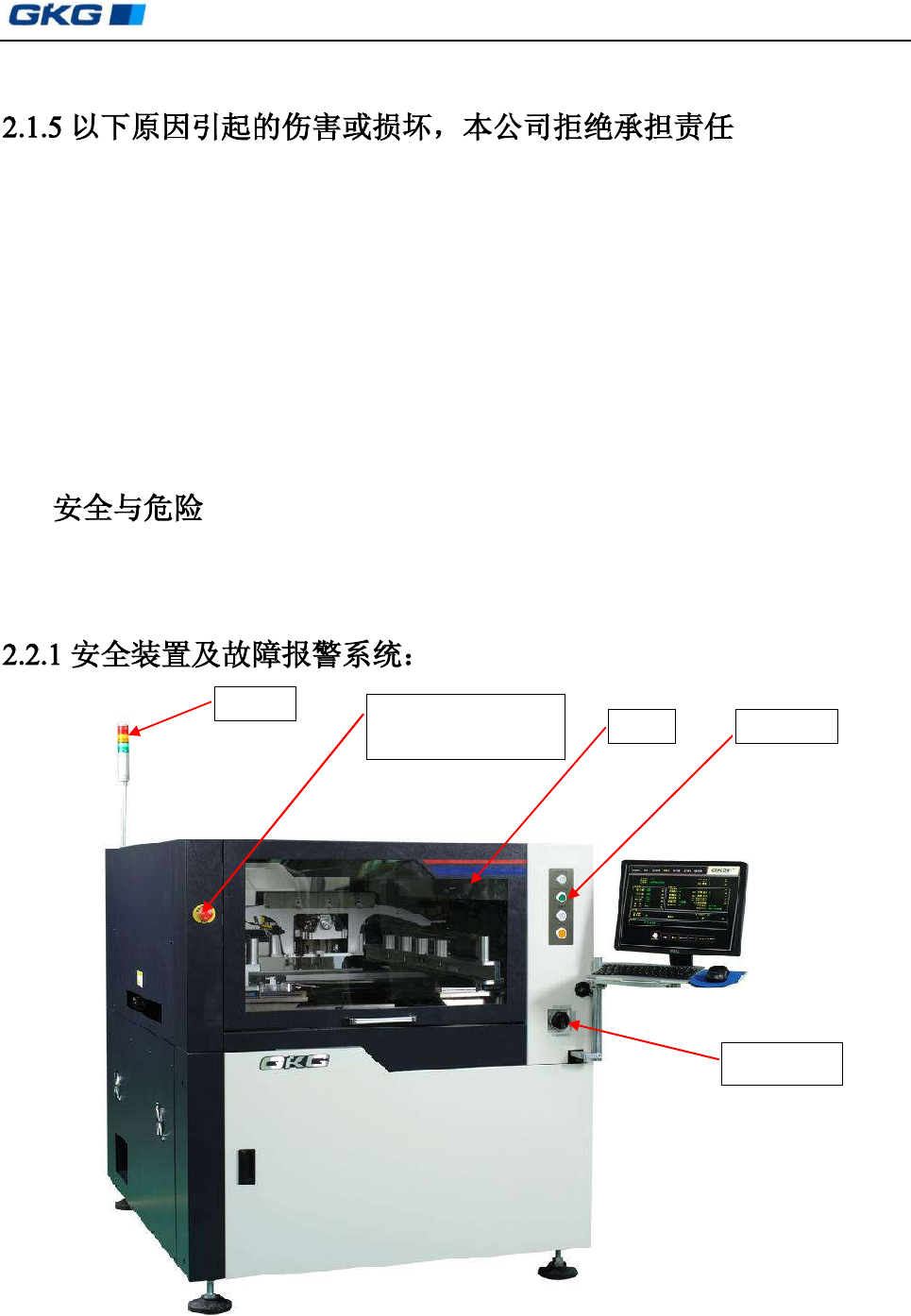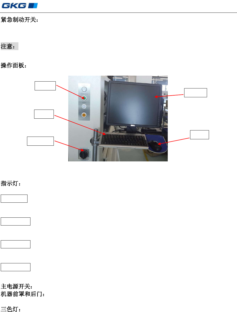 凯格精密机械有限公司 - 6 - 第 二 章 安 全 及 预 防 意 外 事 故 安装在机器前部和后部各一个 (如上图示) 。 按 下紧急制动开关按钮, 则中断 马达供应电源, PC 电源开关仍然接通,此时机器顶部三色灯中的红色灯亮, 蜂鸣器鸣叫报警。 只有在紧急情况下才能按下此 开关按钮 ,此键 按下即 则中断马达的供 应电源;在机器 重新开始工作之前须将此按钮顺时针旋转使之弹起复位。 图 2- 2 操作面板图 POWER ON (白…