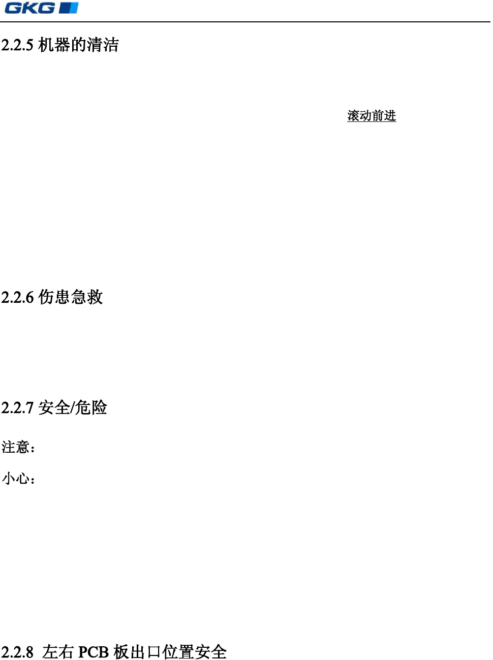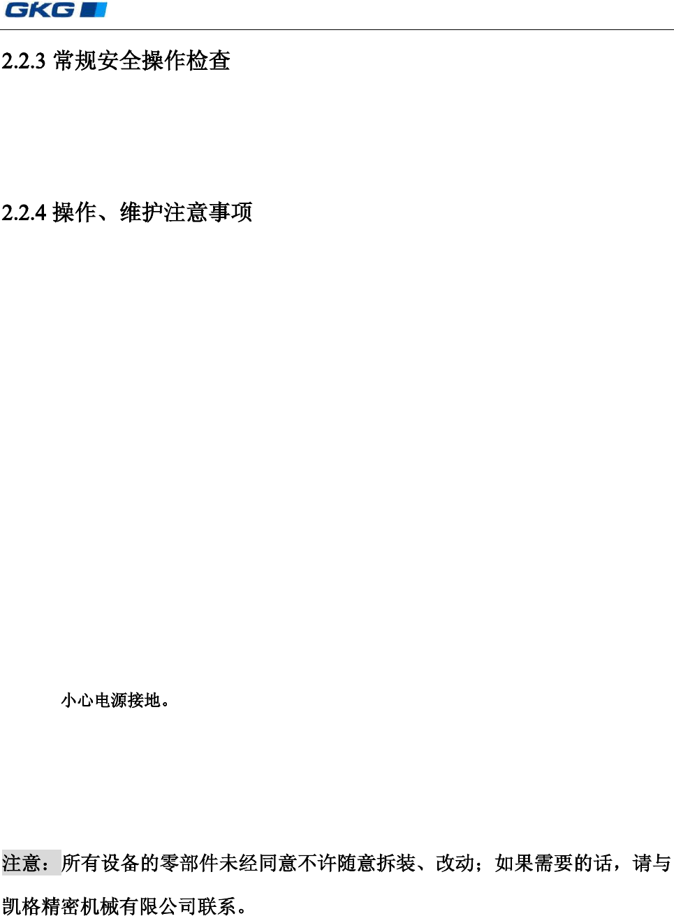 凯格精密机械有限公司 - 8 - 1) 机器仅在安全装置起作用的情况下,进行操作 ; 2) 在打开机器开关之前,应确定机器启动不会伤害到任何人 ; 3) 检查安全装置是否损坏,以确保一旦机器失常工作至少安全装置起作用。 1) 在自动操作方式下,手必须远离设备(特别要注意当 PCB 板上料等待时,看上去处 于停止状态,实际上它会突然发生动作) 。 2) 需要人工清洗时,必须在 [ 人工清洗 ] 界面弹出后进行,不能够将机器暂停然后进行人 …