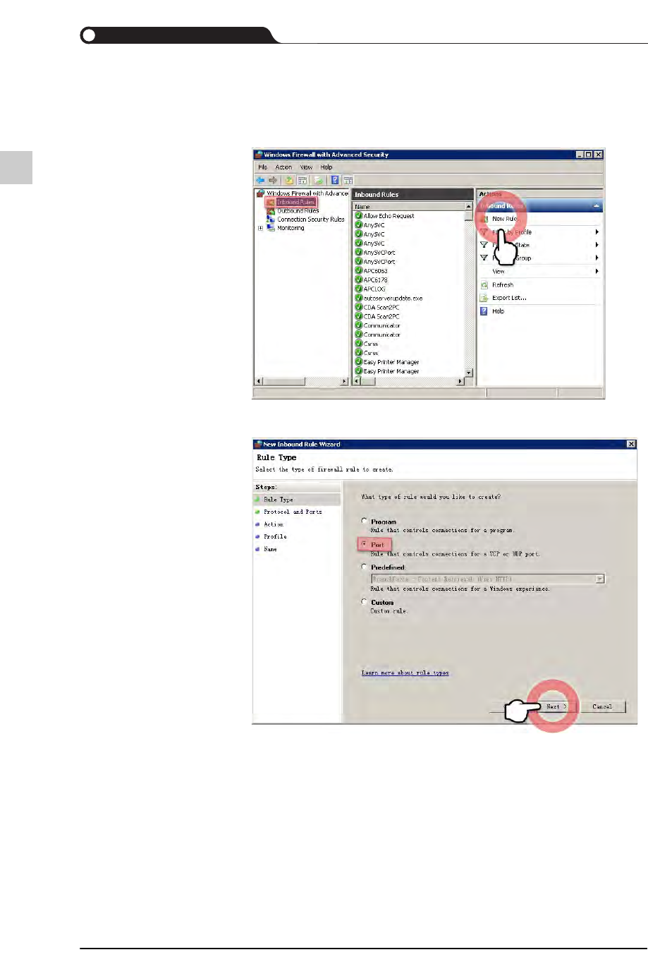 3-11 PC 配置及软件前置安装 STEP3. 选择 <TCP> 或 <UDP> 选项按钮后, 输入要在特定远程端口上打开 的端口号, 然后单击 <Next> 按钮。 STEP4. 选择了 <Al low the connection> 选项按钮后, 单击 <Next> 按钮
