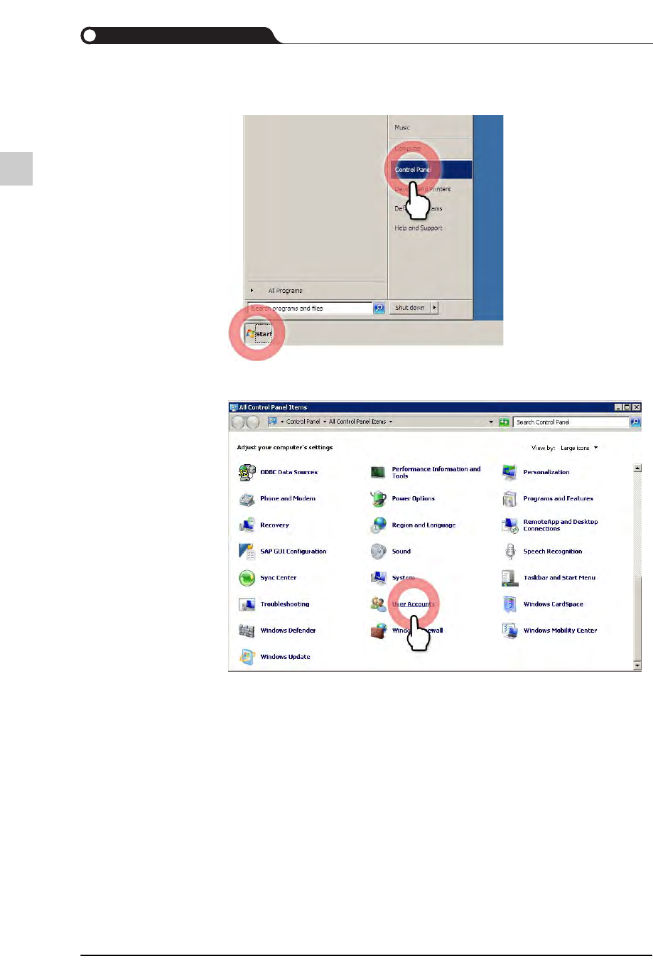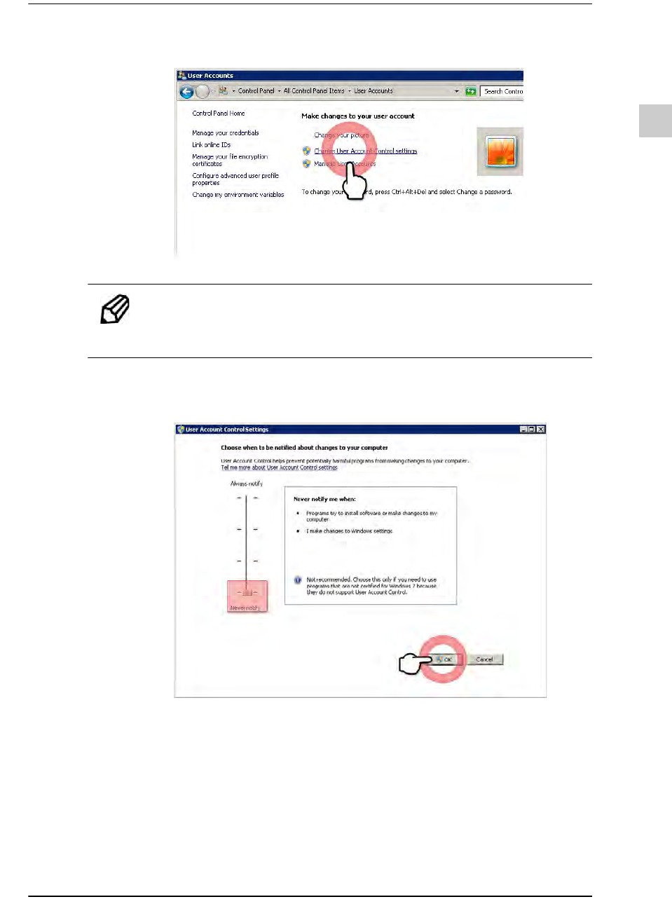 3-19 PC 配置及软件前置安装 STEP4. 选择 “Change User Account Control settings” 菜单 备注 需要针对使用 T- S o l u t i o n 程序的所有用户账户 更改用户账户控 制的设置内容。 STEP5. 在 “User Account Control Settings” 对话框把提示条件改 成 “Never notify” 后, 单击 <OK> 按钮