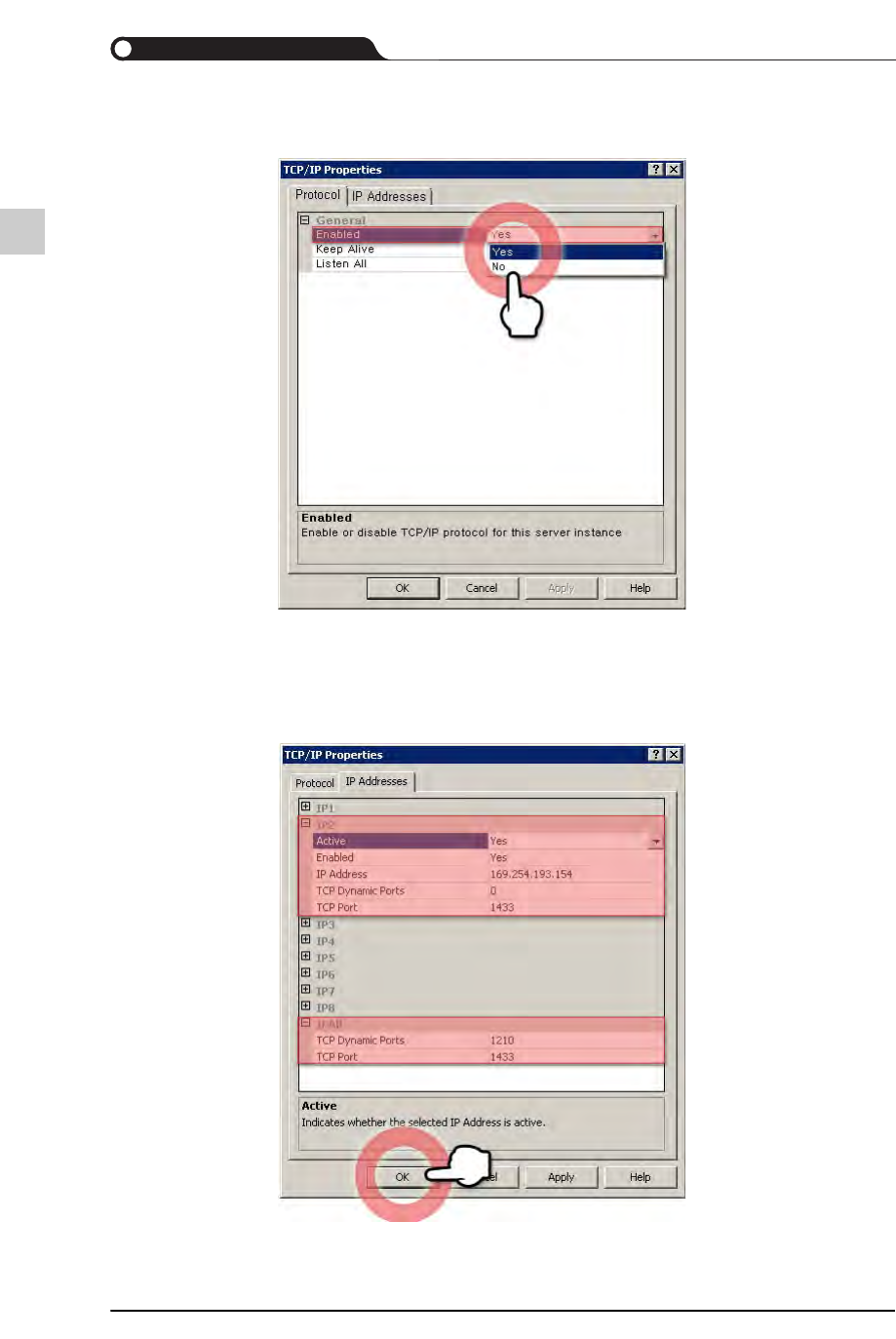 STEP4. 选择了“IP Addresses”选项卡后,在“IP2”的<Enabled>组合框选择“Yes”,然