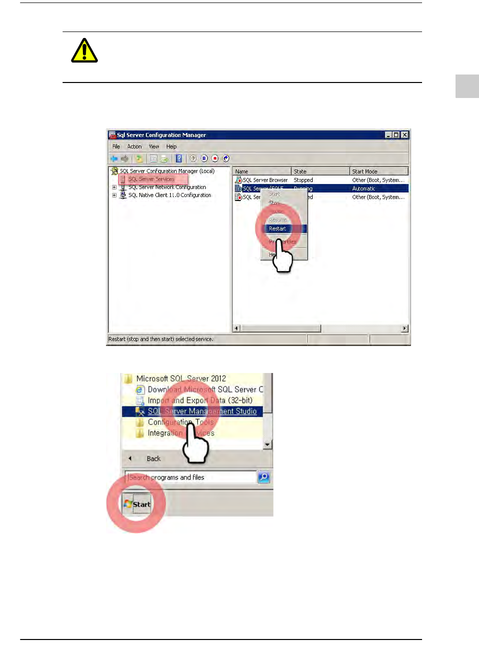 3-33 PC 配置及软件前置安装 注意 如果不输入 TCP 端口的值, 服务器 PC 与客户端 PC 将无法连接到 Database 。 STEP5. 选择 “SQL Server Services” 项再选择 “SQL Server (SQLEXPRESS)” 项后单 击鼠标右键, 然后在弹出式菜单选择 “Restart” STEP6. 单击视窗任务栏的 <Start> 按钮后, 执行 “SQL Server Manag…