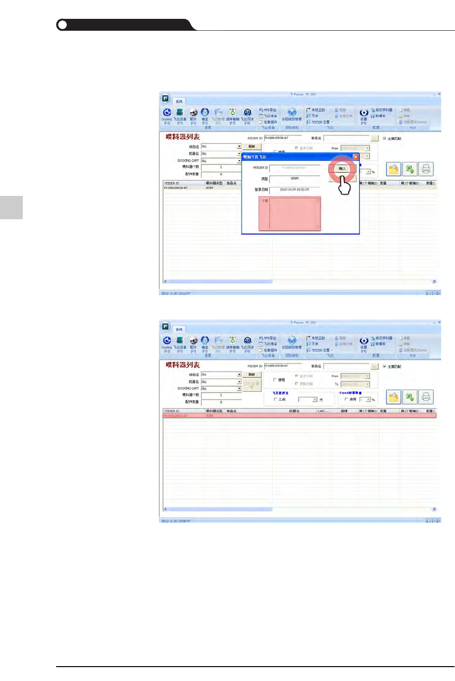 7-4 {TzYG|˅Gn {TzYG|˅Gn 登入后, 在 “ 添加不良供料器 ” 窗口输入 缺陷内容后, 单击 < 确定 > 按 钮 登记成不良供料器的供料器将 在供料器列表上以红色显示。