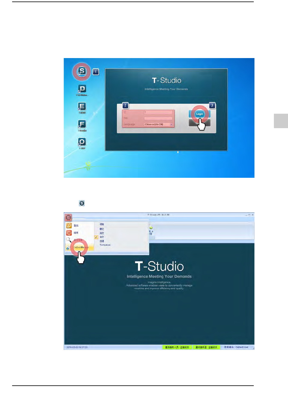 8-13 运行参考事项 8.2.2. 收集记录 (log) 可以利用 CollectManager 有效地管理 T -Solution 上发生的所有记录 (log) 。 STEP1. 实行 T- S t u d i o 输入账号与密码,选择需要使用 的屏幕语言 ( 中文 [zh-CN]) 后,单击 <Login> 按钮。 STEP2. 单击 按钮后, 选择 “CollectManager”