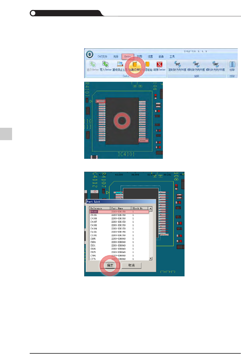 9-55 创建型号数据 STEP7. 单击 < 贴装点排序 > 按钮, 把 CAD 的元件与 Gerber 的元件匹 配起来 为了进行元件排序, 单击 按钮把 CAD 视图尽量放大