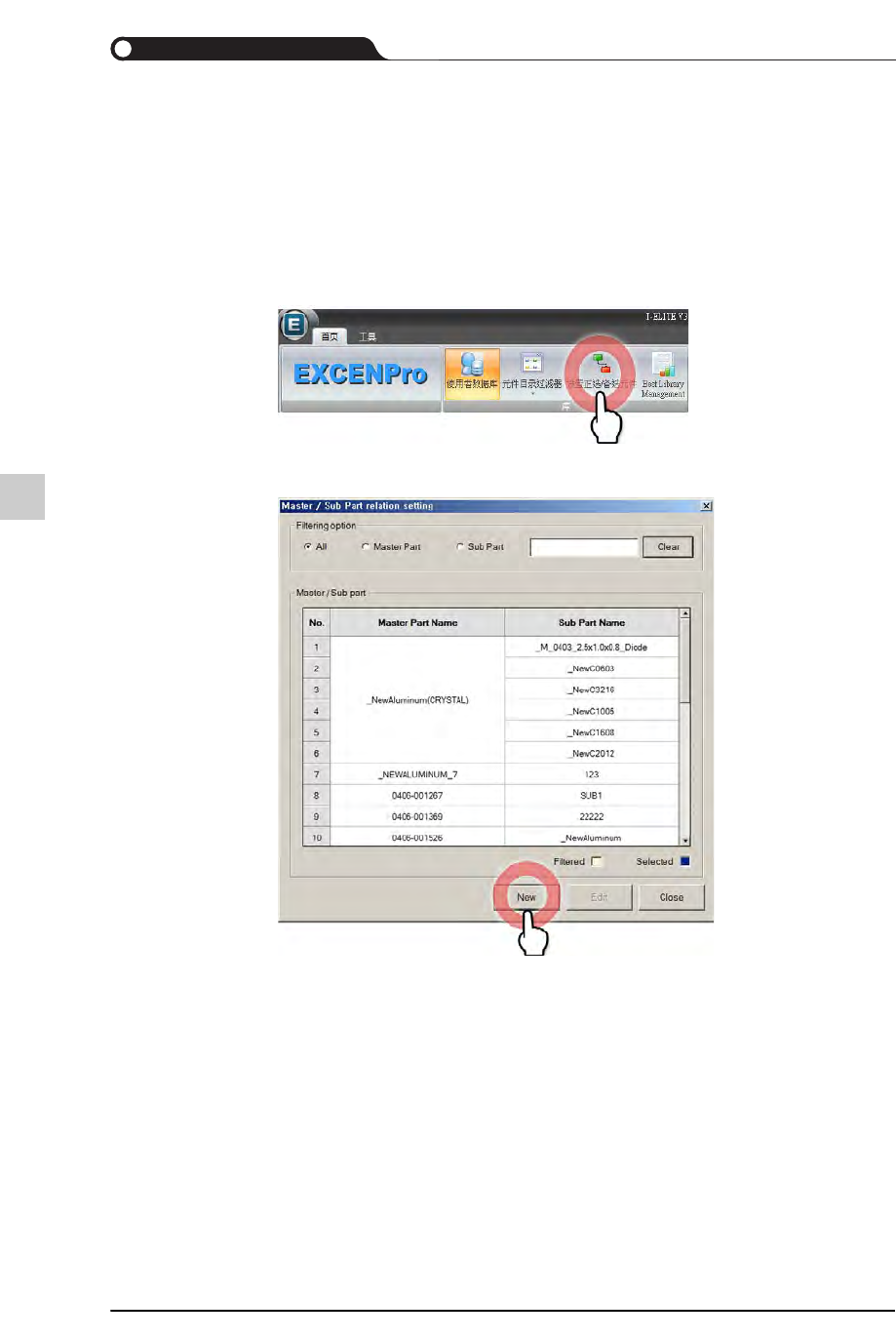 10-7 登记新元件 STEP3. 设置正选元件与备选元件的关系 1: 利用搜索功能搜索需要设置关系的正选元件 2: 在搜索到的左侧元件目录选择正选元件 3: 利用搜索功能搜索作为所选正选元件的替代元件使用的元件 4: 在搜索到的右侧元件目录选择相当于备选元件的复选框 5: 单击 <Apply> 按钮设置关系 10.4.2. 修改 修改已经设置的正选元件 / 备选元件的关 系。 针对正选元件与备选元件的关系进行 编辑的方法如…