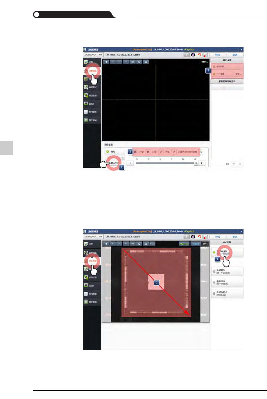 STEP13. 在“中心识别”菜单设定ROI及排列元件