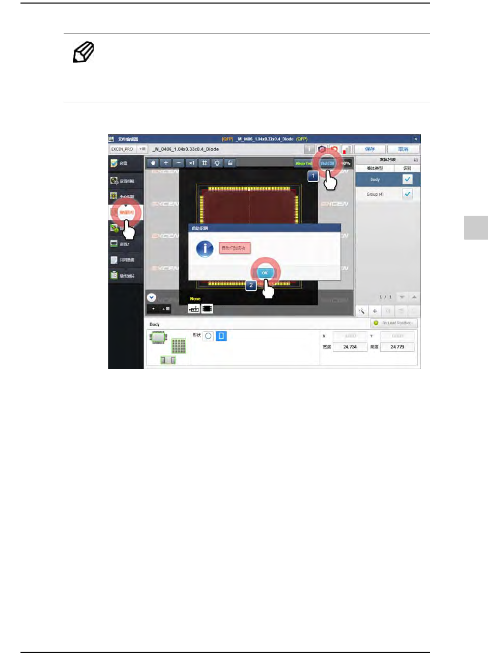 10-19 登记新元件 备注 如果无法自动补正 ROI 与元件登 记角度, 则单击 < 手动 ROI> 按钮与 < 手动排序 > 按钮后以手动方式设置 ROI 与元件登记角 度。 STEP14. 在 “ 编辑形状 ” 菜单单击 < 自动识别 > 按钮 1) 单击 < 自动识别 > 按钮 2) 查看结果后单击 <OK> 按钮