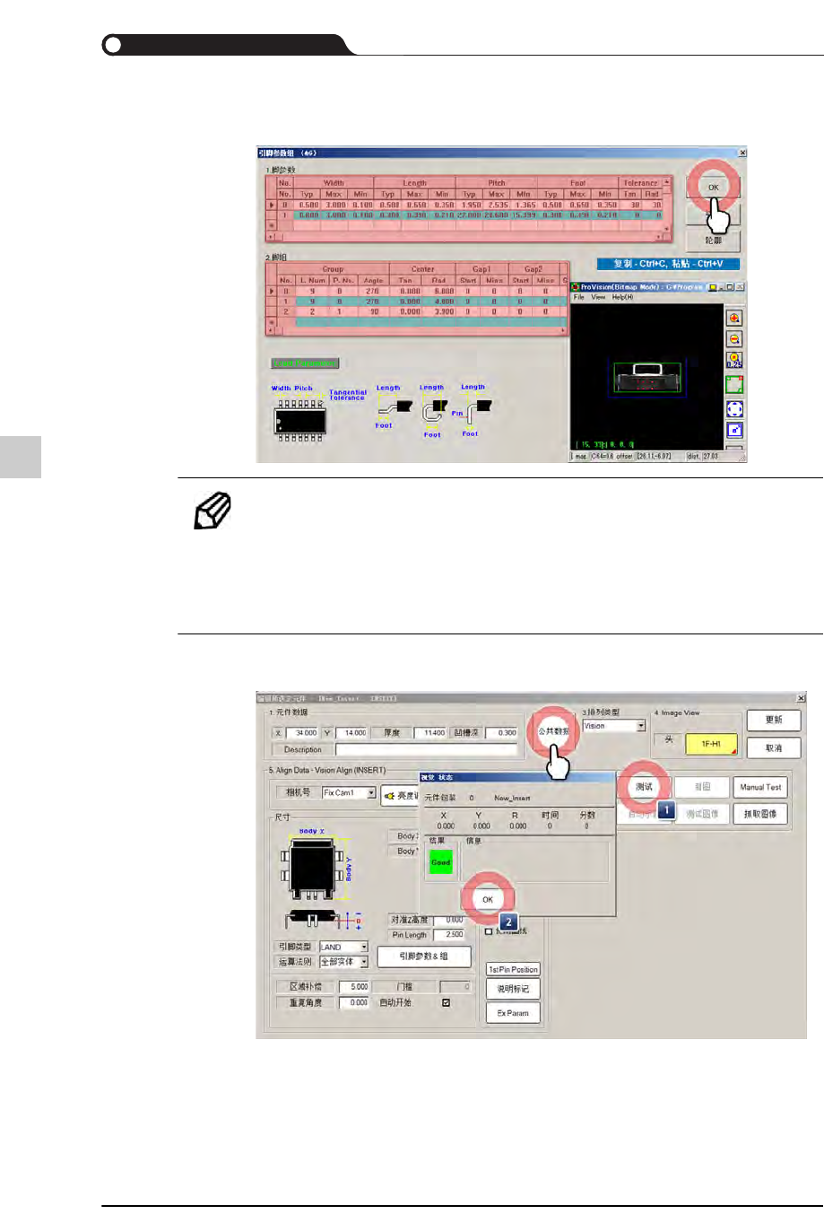10-84 {TzYG|˅Gn {TzYG|˅Gn STEP16. 以手动方式设置需要识别的引脚或销的 相关参数, 单击 <OK> 按钮 备注 手动方式设置引脚参数的详细内容 , 在 WEB 手册, 请参阅 “ 手 动设置 ” 。 (WEB 手册 : T -Solution2 > 运行脚本 > 登记新元件 > 在 T -ELITE 登记元件 (NP…