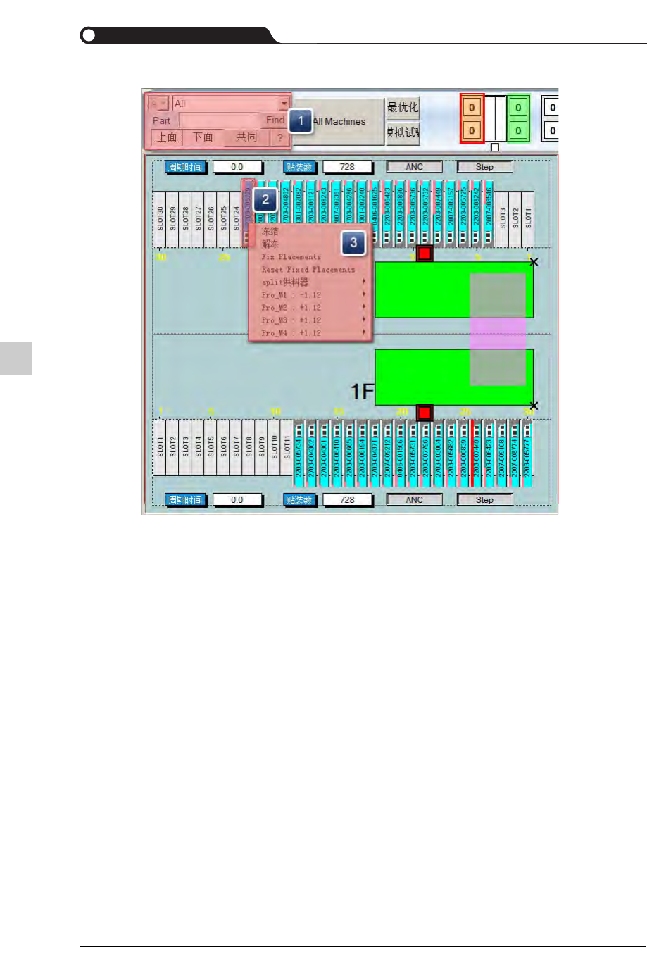11-20 {TzYG|˅Gn {TzYG|˅Gn 1: ‘ 选择 JOB 文件 ’ 领域 2: 各供料器状态的颜色信息 3: 供料器弹出式菜单 ‘ 选择 JOB 文件 ’ 领域 选择了 JO B 文件后, 将显示相应设备的供料器配置画面。 All Machines 可以把生产线的一切带式供料器 加以清除 / 固定 / 解除固定, 或者把生产线的一 切供料器底座插槽设置…