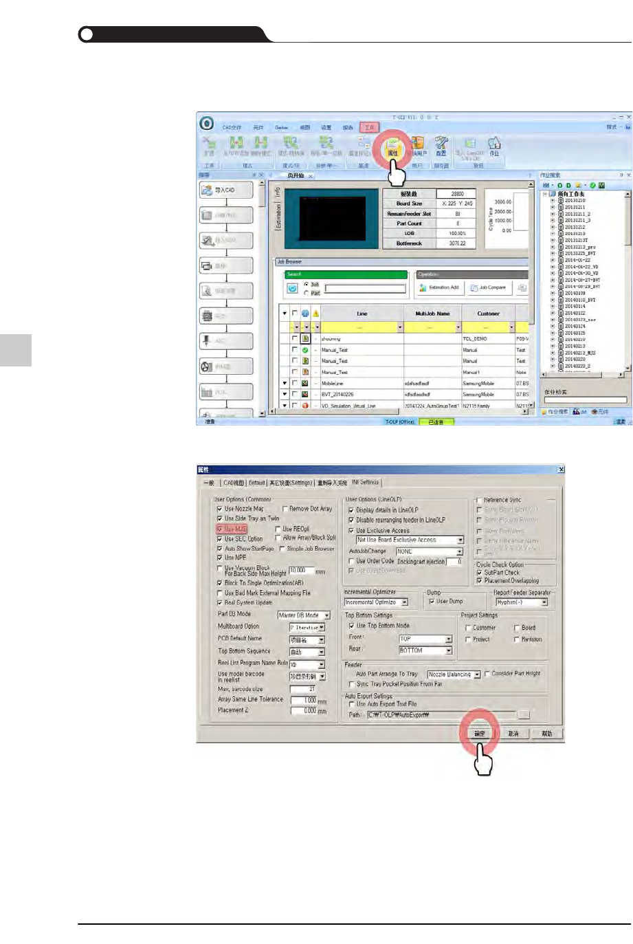 11-59 优化 PCB 程序 创建作业 > Multi Job Setting) 备注 如果能够利用当前生产线中可使用 的整体供料器生产登记在 多程序的整体型号, 就不必新建供料器配置群。 11.5.3. 多程序优化 需要优化多程序时, 不能适用先前 T- O L P 所使用的优化算法而需要适用其它优化算 法。 基本上, 多程序需要使用同一供料器配置内容, 因此需要把优化选项设置不同的 值。 优化多程序的方法如下。 STEP1.…