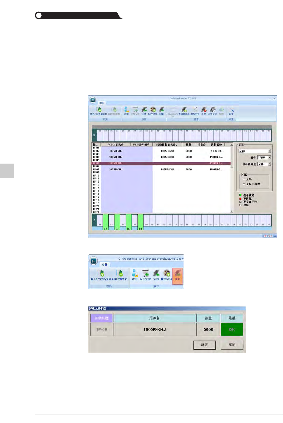 12-40 {TzYG|˅Gn {TzYG|˅Gn 12.6. 卸载元件卷轴 12.6.1. T-Basic Feeder 在进行生产之前, 在 T -Basic Feeder 把安装的元件料带 清除的方法如下。 STEP1. 在列表上选择需要卸载的供料器 。 STEP2. 单击 < 卸载 > 按钮。 STEP3. 在 " 卸载元件料盘 " 窗口…