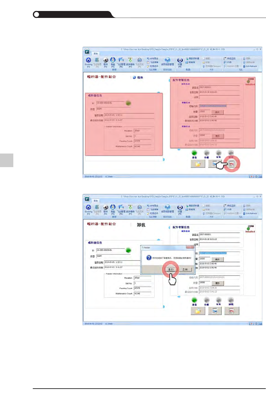 12-42 {TzYG|˅Gn {TzYG|˅Gn STEP2. 确认供料器信息与元件卷轴信息 后, 单击 < 卸载 > 按钮 STEP3. 在元件卷轴拆卸窗单击 < 是 (Y)> 按钮