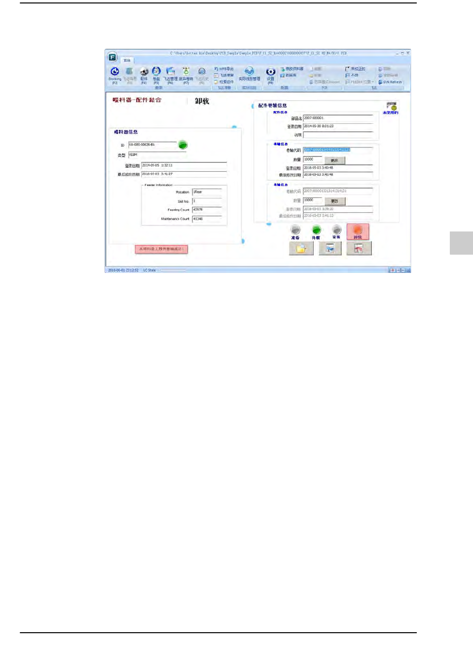 STEP2. 确认供料器信息与元件卷轴信息后,单击<卸载>按钮