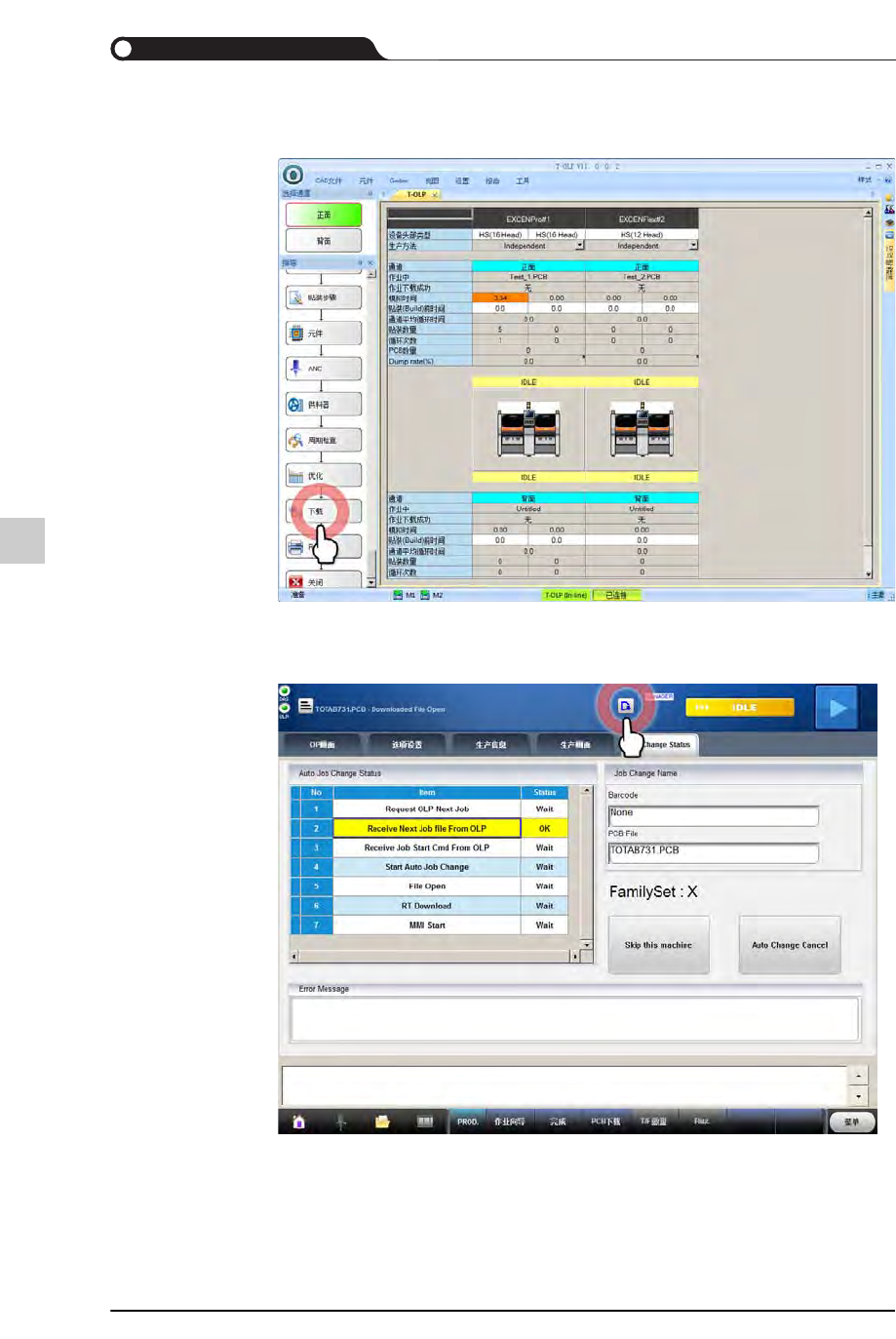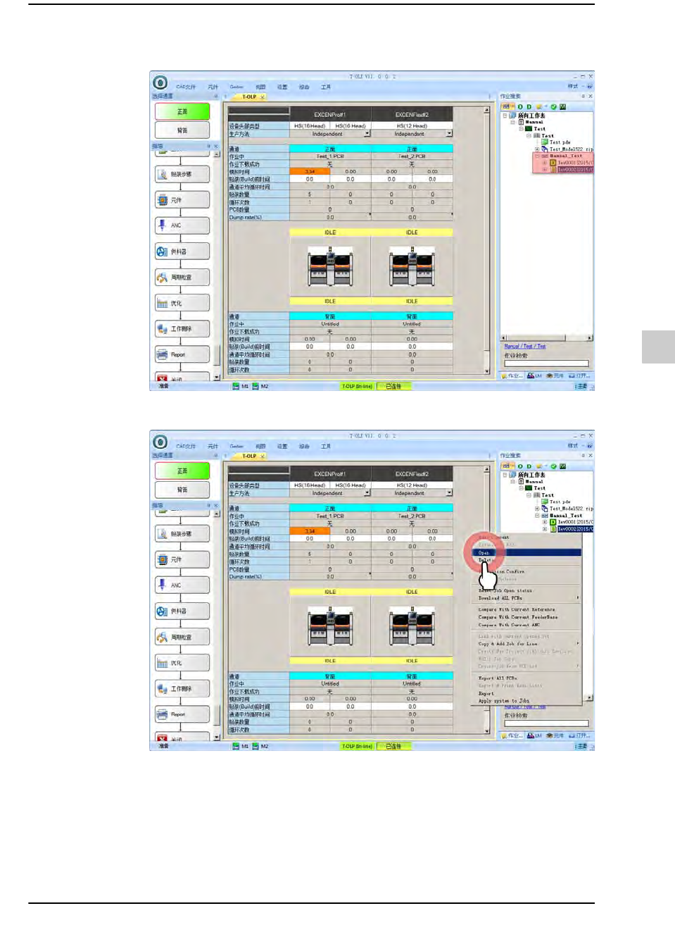 12-53 准备生产 STEP1. 在 In-line T–OLP 选择下一个生产的模式 (Model) 的 JOB 文件。 STEP2. 选择需要下载的 PCB 程序后单击鼠标右 键, 在弹出的菜单选择 “Open” 。