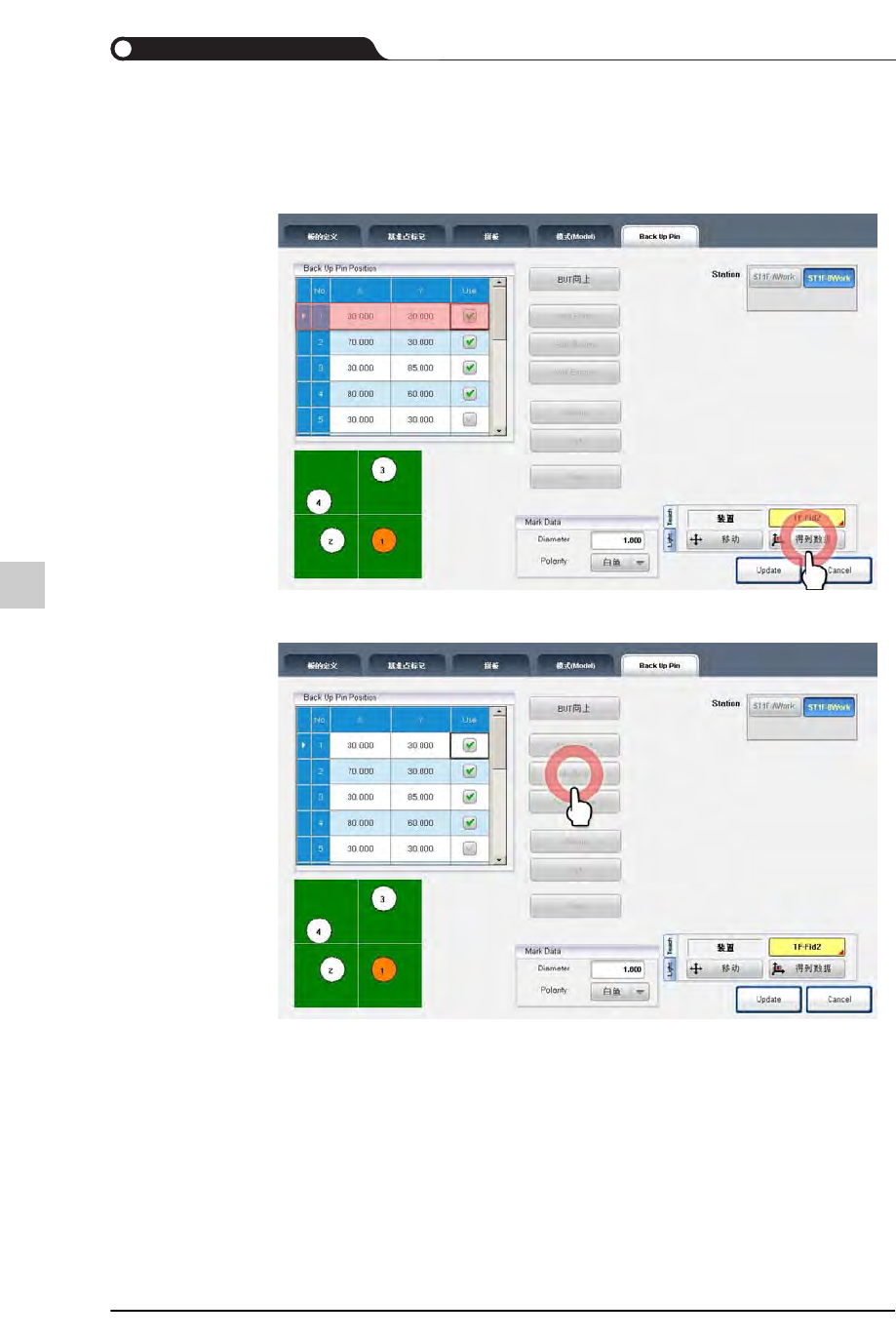 STEP9. 在<Backup Pin Position>领域选择其位置被改变的顶针后,利用视觉窗的