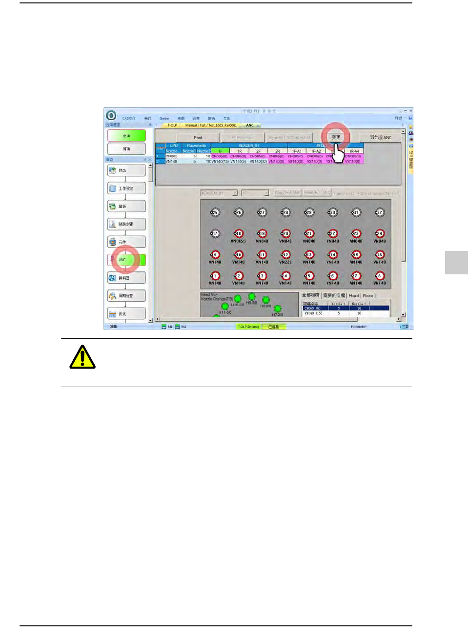 13-39 生产 13.6.3. 修改吸嘴配置 在设备修改已打开的 PCB 程序的吸 嘴配置的方法如下。 STEP1. 在 In-line T -OLP 单击 <ANC> 按钮后选择需要修改吸嘴配置的设备, 然后单 击 < 变更 > 按钮。 注意 如果没有被设置成使用 ‘ 互斥控制 ’ 功能, 则不能修改吸嘴配置信 息。