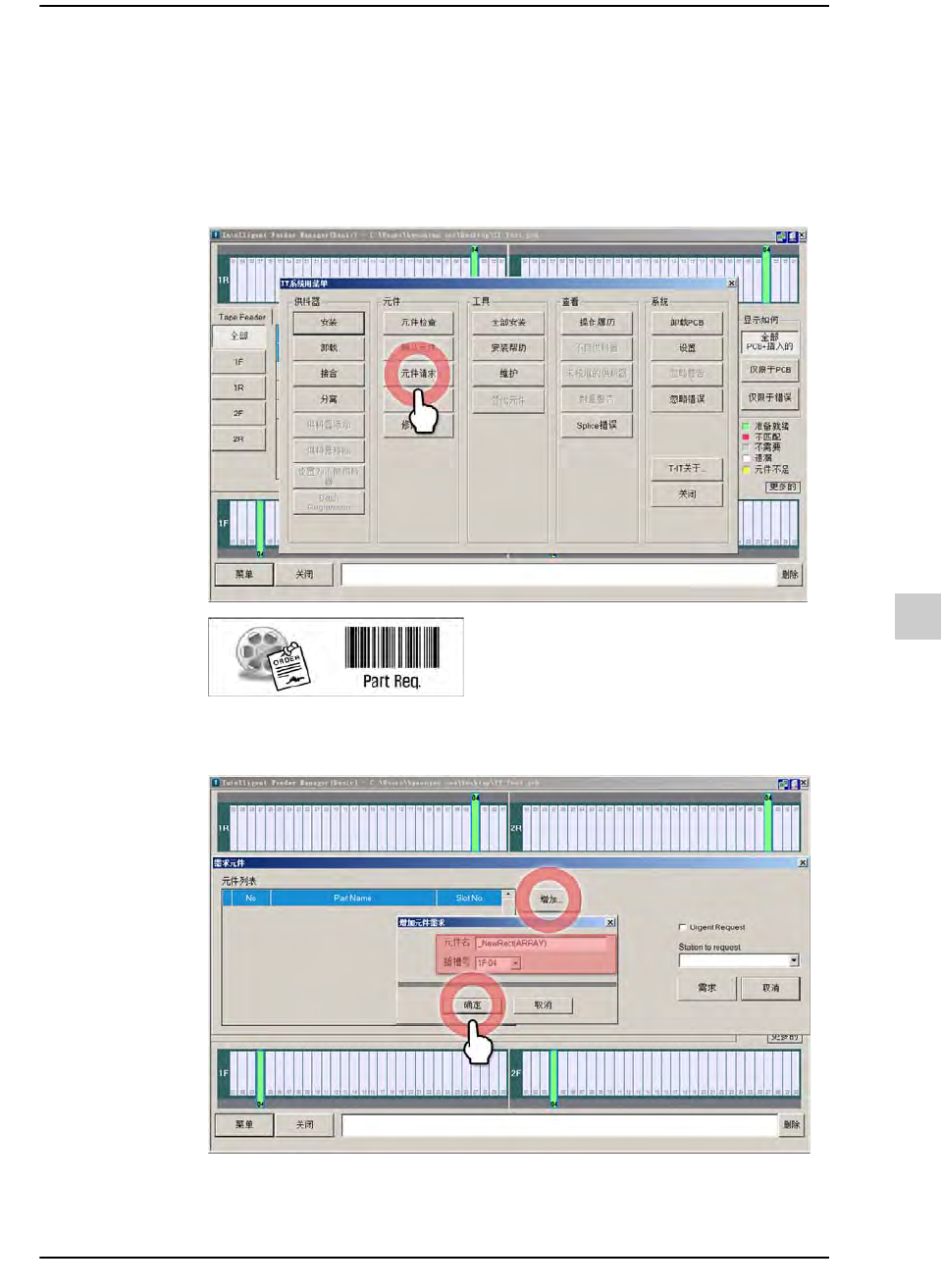 STEP2. 扫描不足元件的条形码或者单击< 增加>按钮,输入需要请求的元件名与
