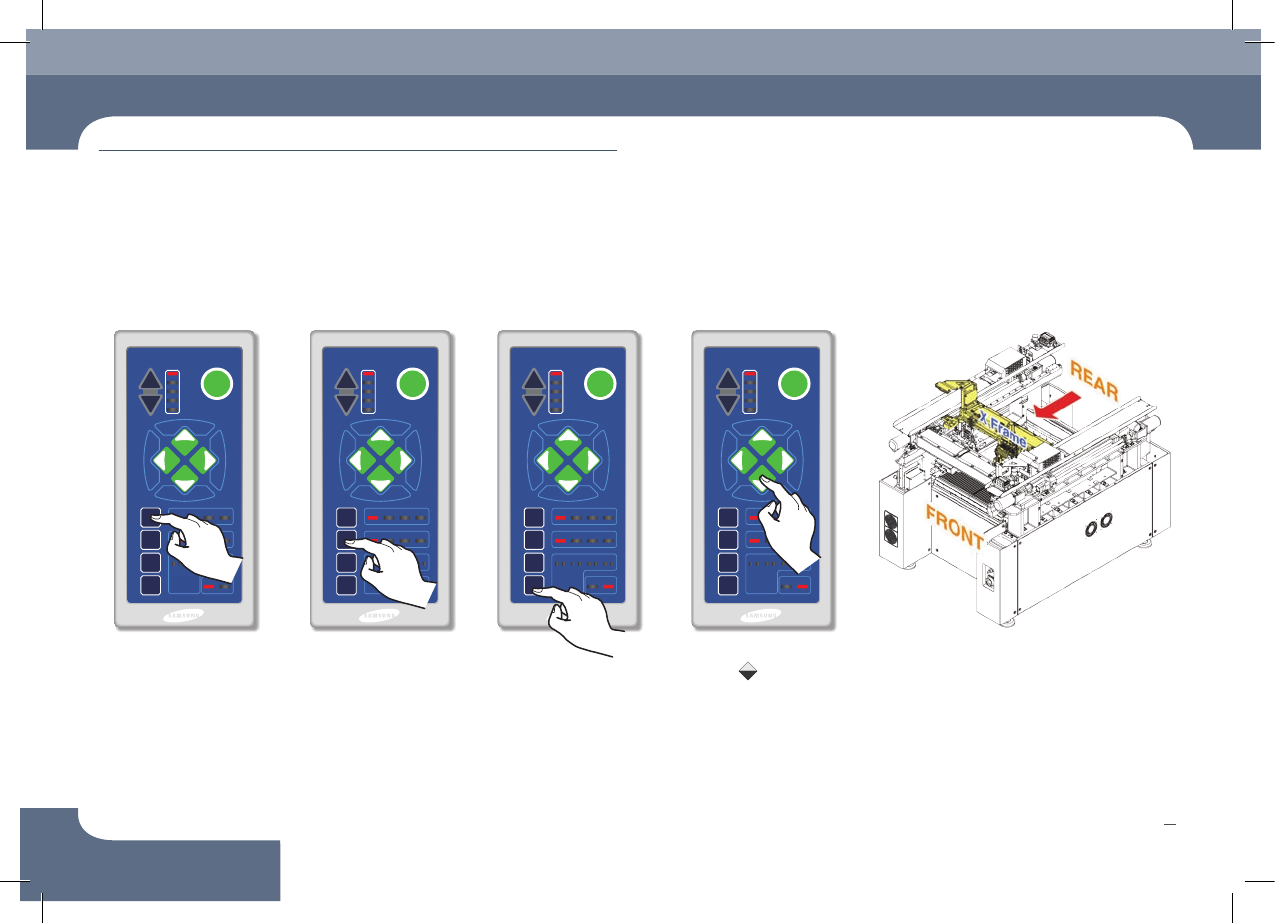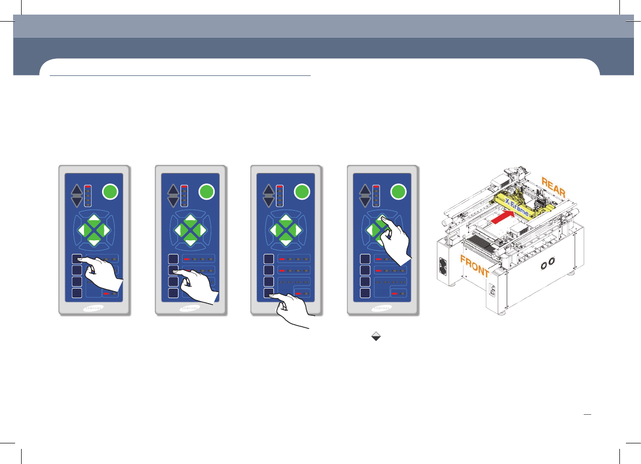 1. 按‘MODE’按钮 2. 按‘AXIS’按钮 3. 按‘G.SEL’按钮 4. 按操作键 Rear X Frame前面移动