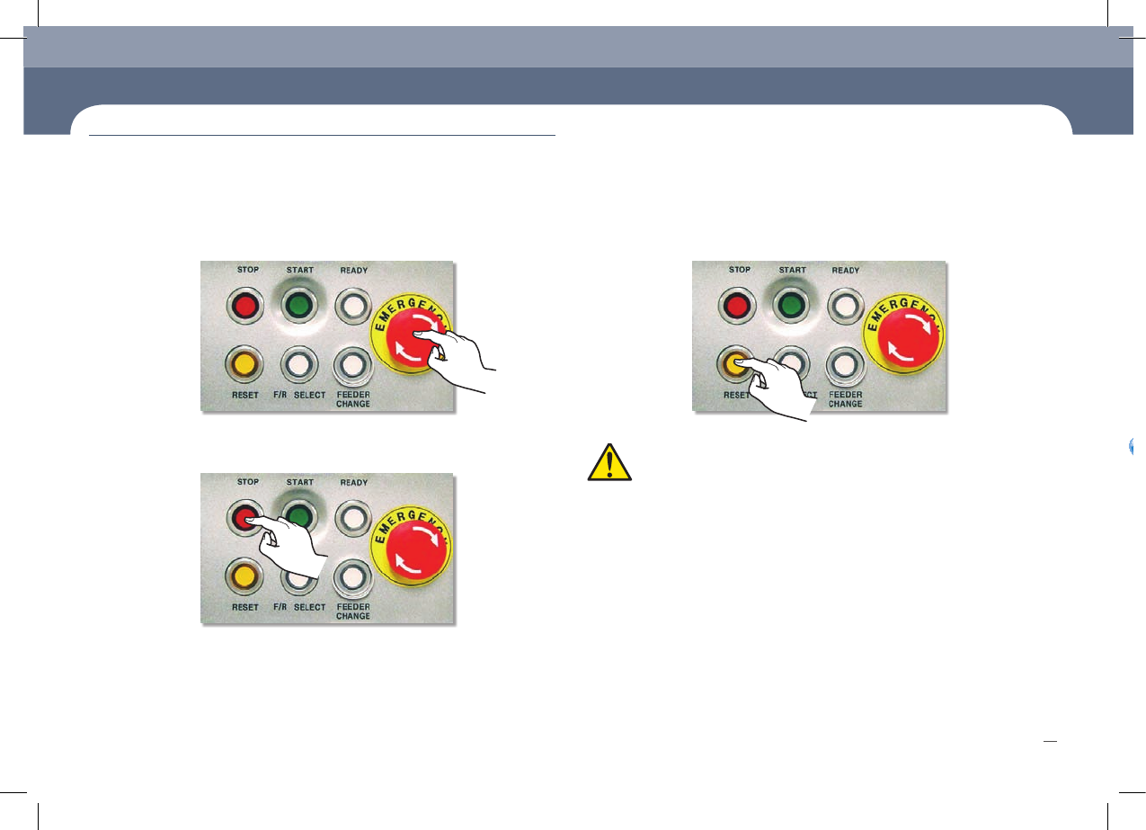 SM431 Maintenance Handbook 14 Chap ter 1 Fast & Flexible Chip Shooter 维 护 条 件 本部 分介 绍设 备维护 作业 环境 、作业 工具 、维 修项 目等 。 3 . 撤 销 紧 急 停 止 1. 按 ‘EM G’ 开 关 2. 按 ‘ST OP’ 按钮 3. 按 ‘RE SET ’ 按 钮 警告 务必 排除 紧急 停止原 因后 重新 启动设 备.