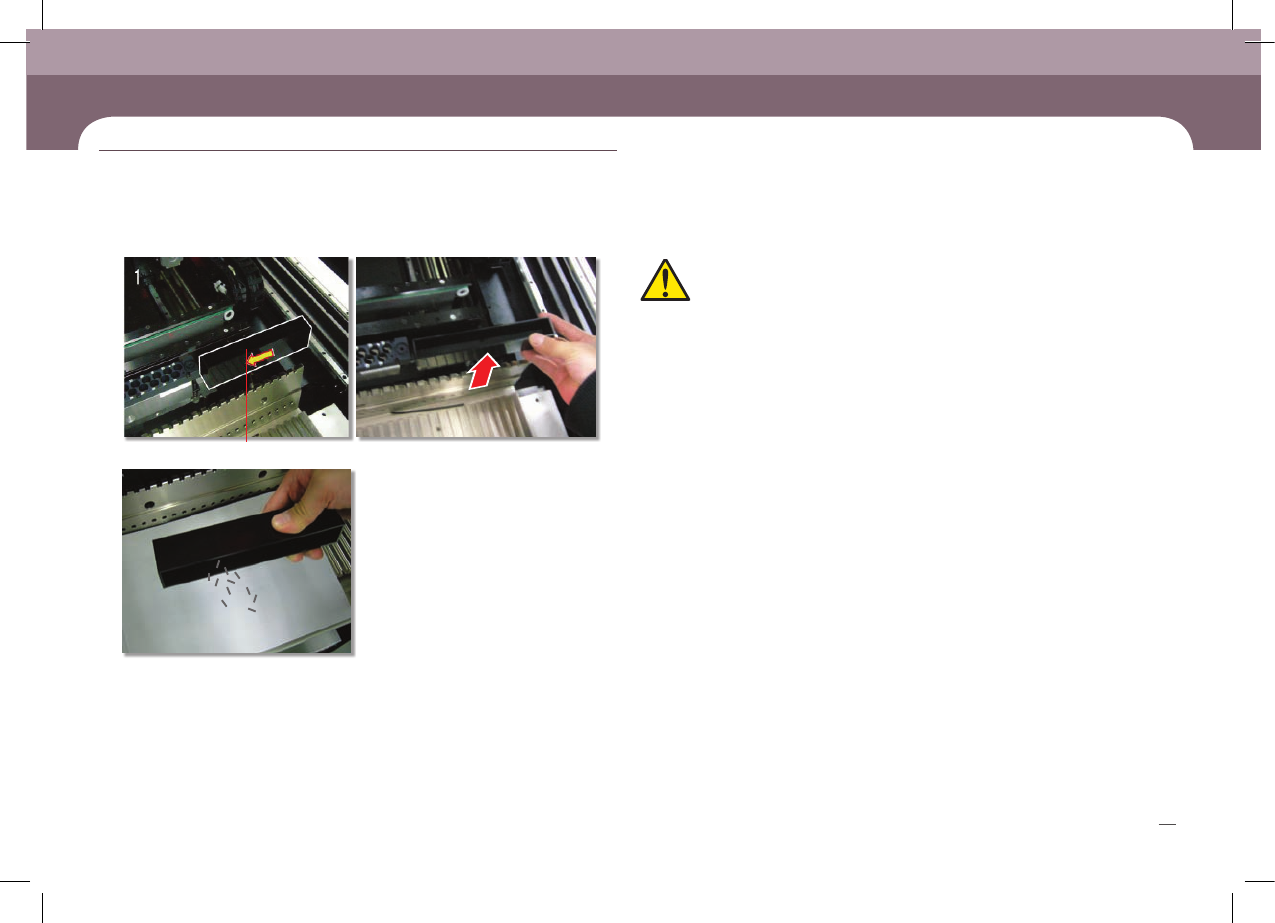 SM431 Maintenance Handbook 28 Chap ter 3 Fast & Flexible Chip Shooter 1 2 3 - 分离 Dump Box( 废料 盒) Dump Box( 废料 盒) 日 常 检 验 目 录 4. 参考 “ 解 除紧急 停止 (14 页 )” 解 除紧急 停止 后重新 进行作业 注意 安装 废料 盒时 ,贴在 废料 盒上 的箭头 贴纸 的方 向必 须朝 向AN C。