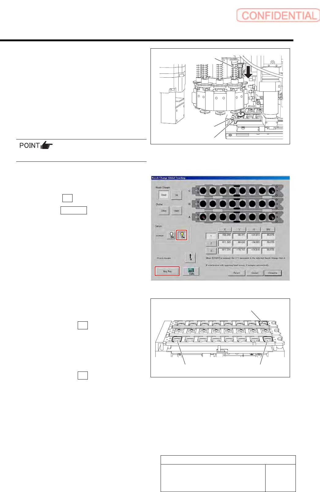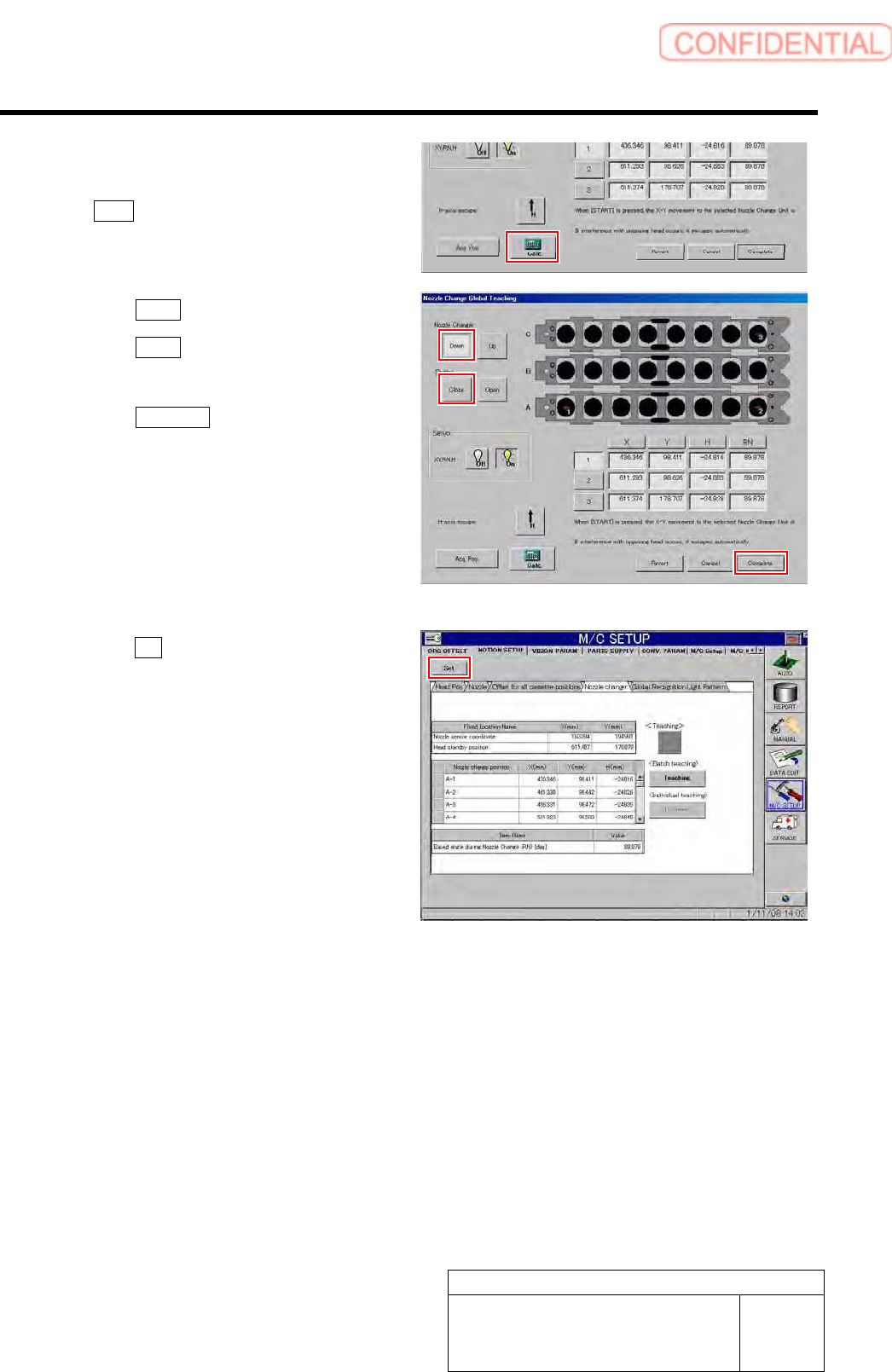 Calibration HLGB-10307-01 Nozzle Changer T eaching SHEET 5/5 14 When the co ordination of the three positions (A-1, A-8, an d C-8) has been acquired, click the Calc. button. Coordinate of the other no zzle replacing posi…