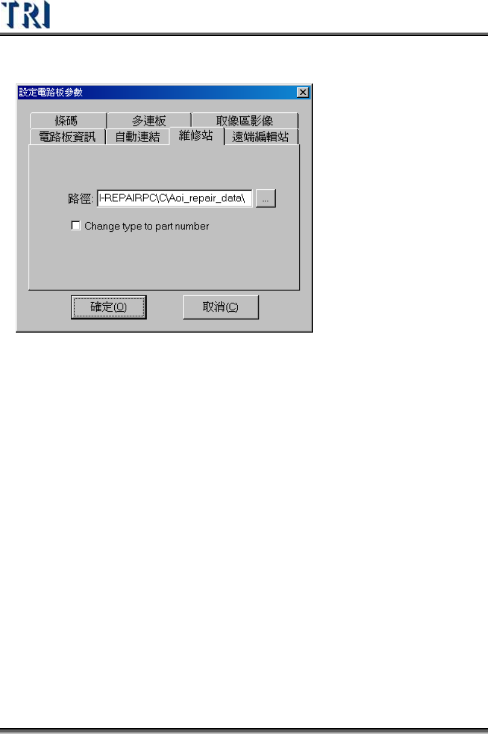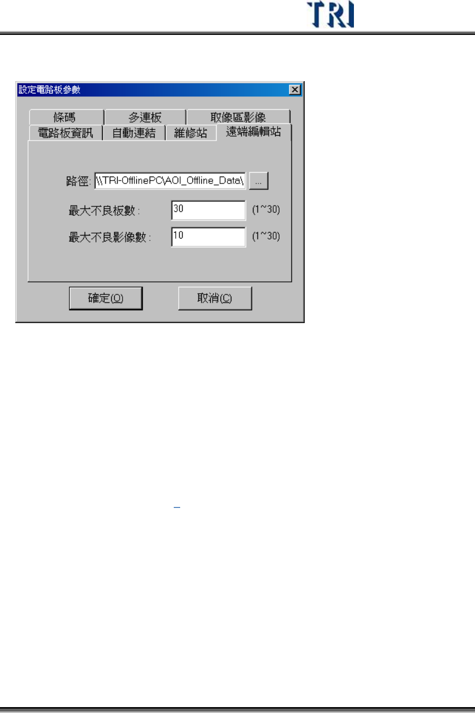 Test Research Inc. TRI 7500 Series User Gu ide – Software 93 3.3.3.6 遠端編輯站 (Offline Editor) 機碼 – 在遠端編輯站端選擇要進 行連 線編輯的 AOI 機器號碼。 路 徑 – 指定遠端編輯站資 料 夾的 路 徑 來 存取檢測資 料 。正常情況下 路 徑應設為 [\\OfflinePC\C\A OI_Offline…
