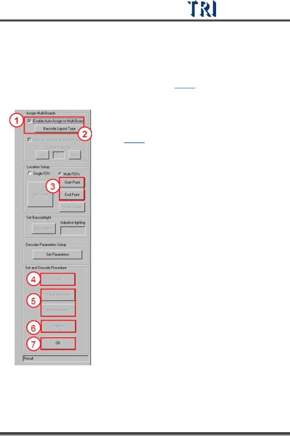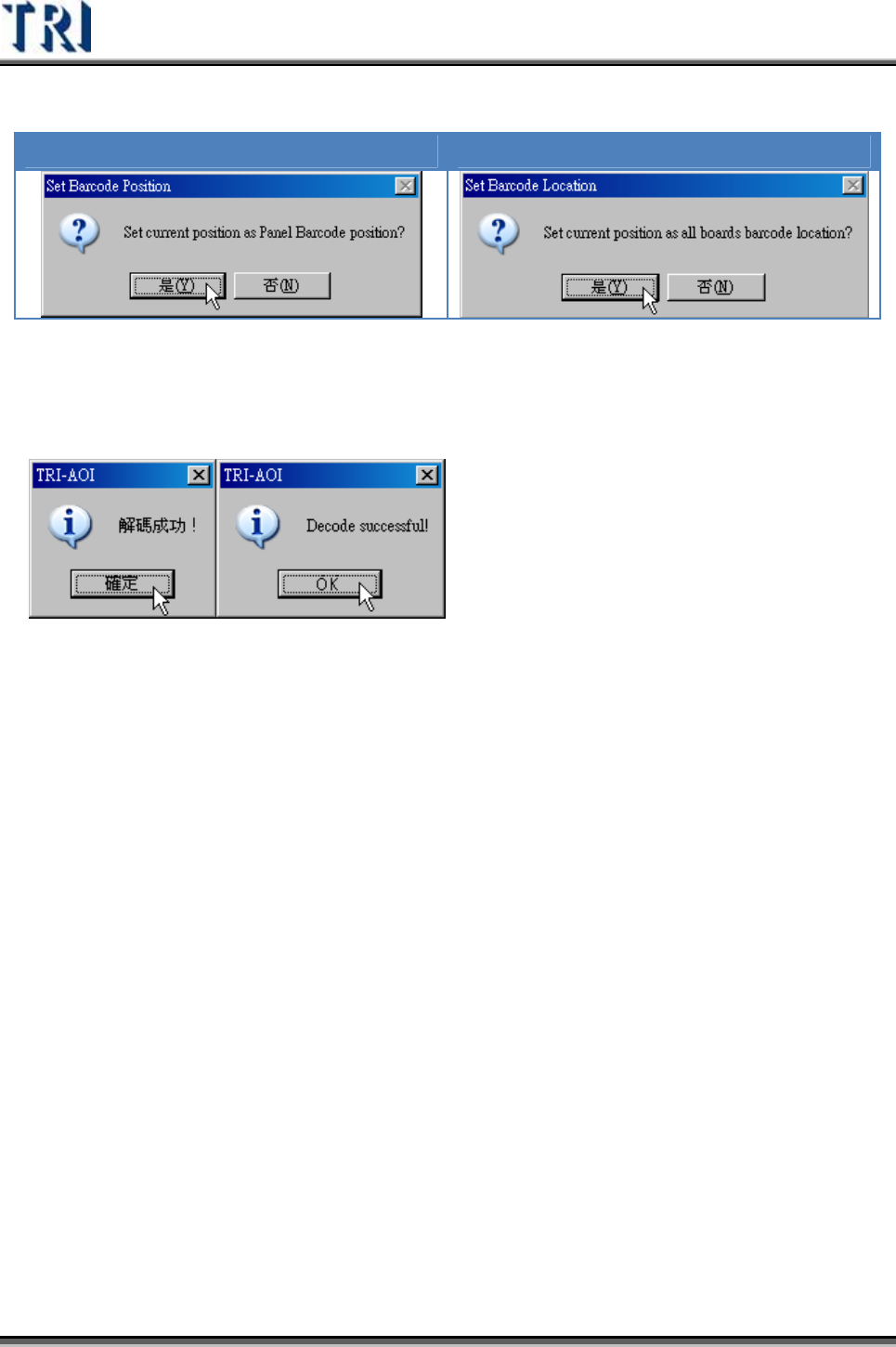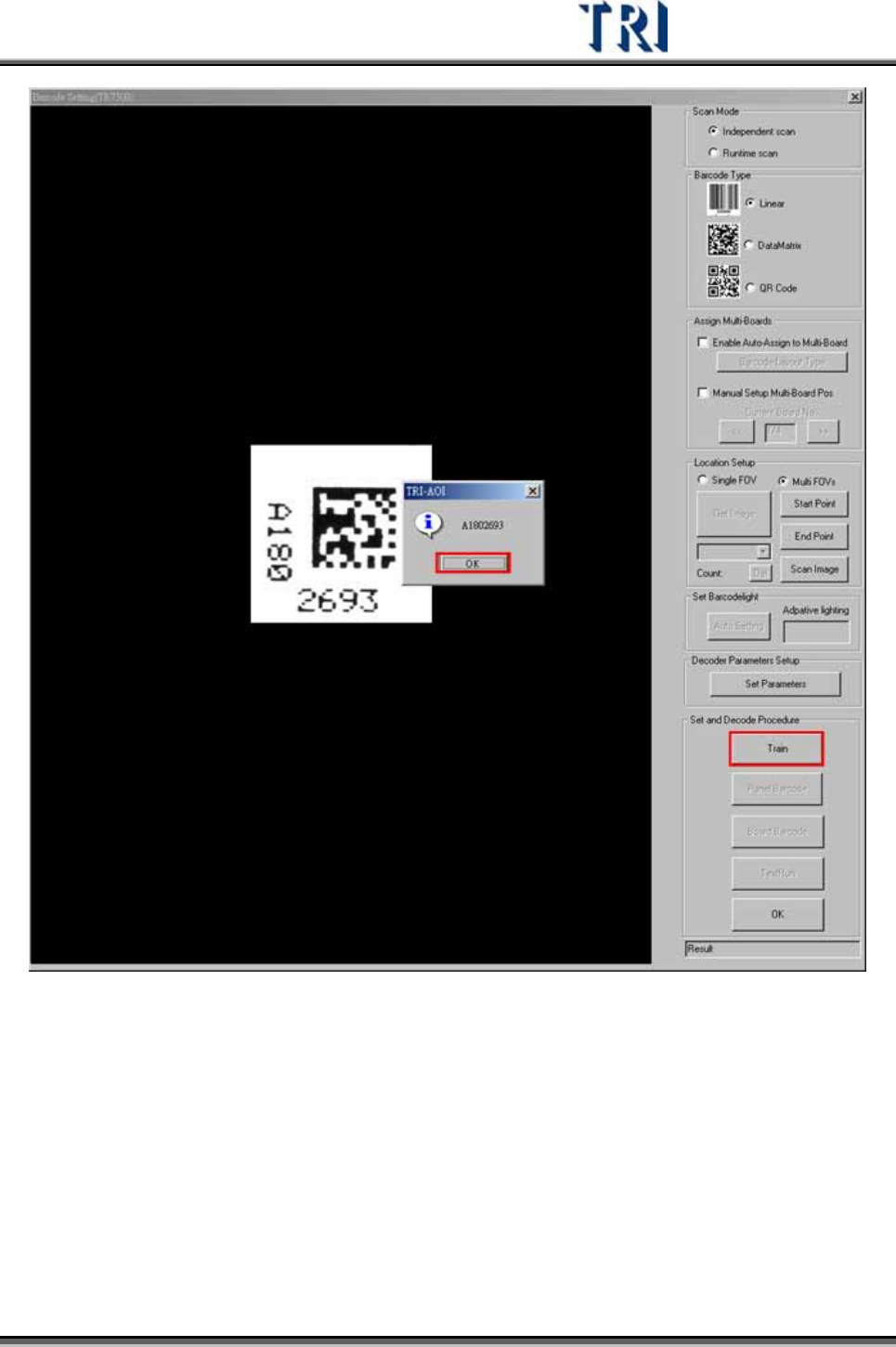 Test Research Inc. 100 TRI 7500 Series User Gu ide – Software Panel Barcode Board Barcode Step5. 按下 [TestRun] 鈕解碼。系統會根據設定所要 讀 取的條碼 數 目,對於所有條碼 取像並進 行 解碼的動作。需確認所有的條碼都可被正確解碼。 Step6. 按下 [OK] 按鈕完成設定。 3.3.4.3 Scan …