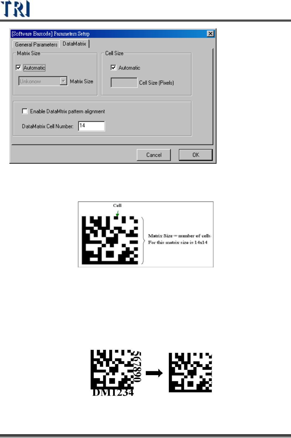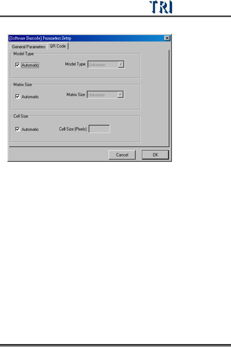 Test Research Inc. TRI 7500 Series User Gu ide – Software 111 QR Code z Model Type— 條碼的編碼型態。系統預設『自動偵測』。 z Matrix Size— 陣 列 尺寸。系統預設『自動偵測』。意義與 DataMatrix Matrix Size 同。 z Cell Size— 陣 列 元素尺寸( Pixel )。系統預設『自…