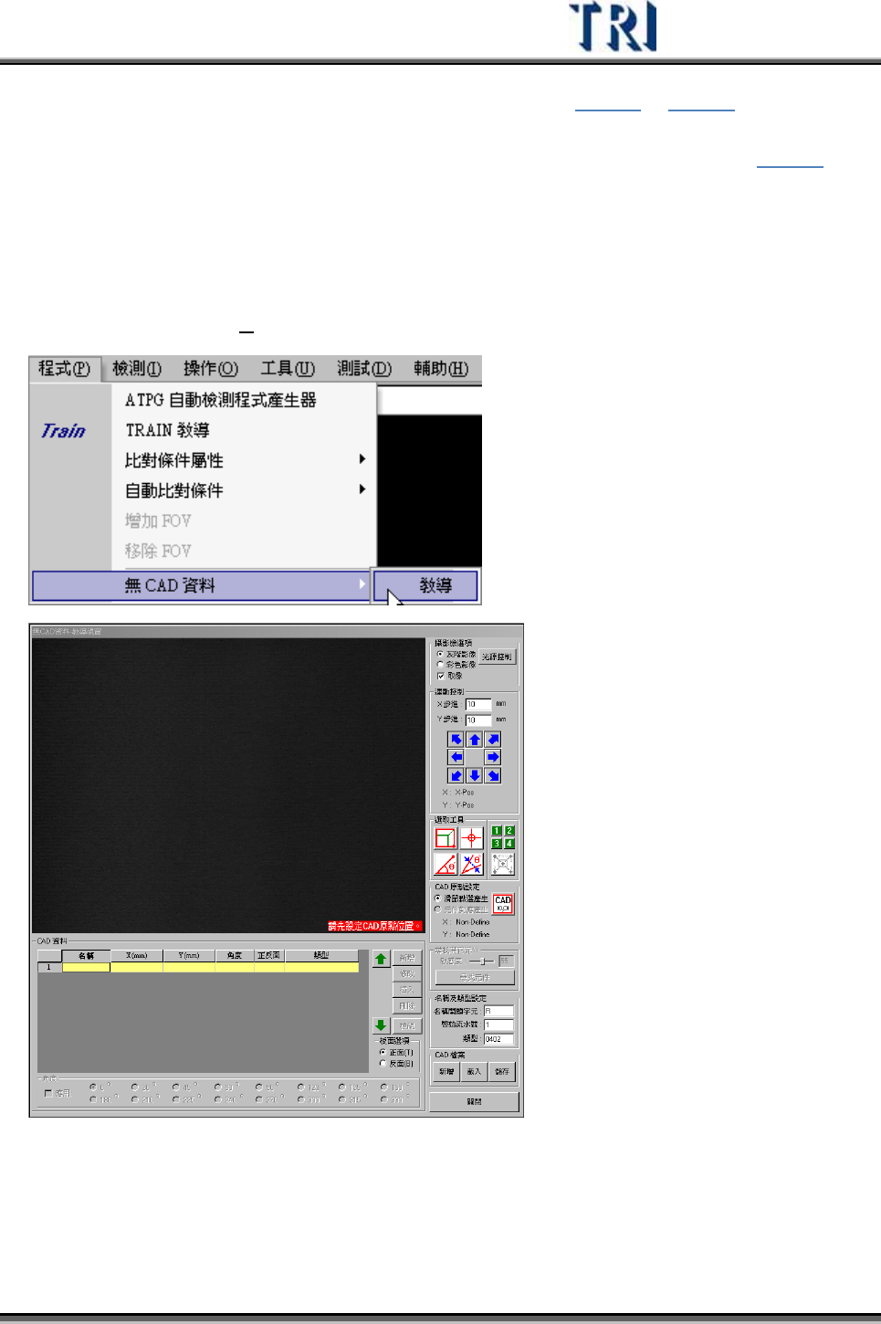 Test Research Inc. 124 TRI 7500 Series User Gu ide – Software 3.4.6 移除 FOV(D ELETE FOV) 只有在 [Train] 畫面開啟時,此功能才有作用。 點選 [ 移除 FOV] 按鈕時,會剩下左上方大圖以及左下方的 FOV 影像,移除 FOV 的 方法有二: z 可以直接在大圖上點選要移除的 FOV 位置,而攝影機會移動到所點選…