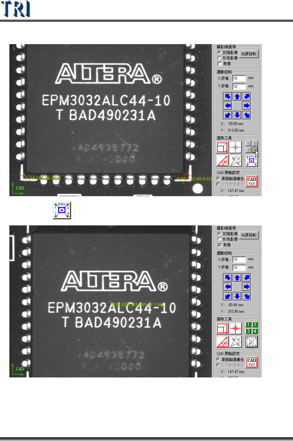 Test Research Inc. 130 TRI 7500 Series User Gu ide – Software Step2. 以同樣方法,依序找到其餘三個角 落 後按下 [2] 、 [3] 、 [4] 按鈕,建 立 其座標。 Step3. 按下 按鈕,系統及自動計算出元件的中心位置。 Step4. 輸入名稱及 類 型後,按下 [ 新增 ] 鈕,新增元件。
