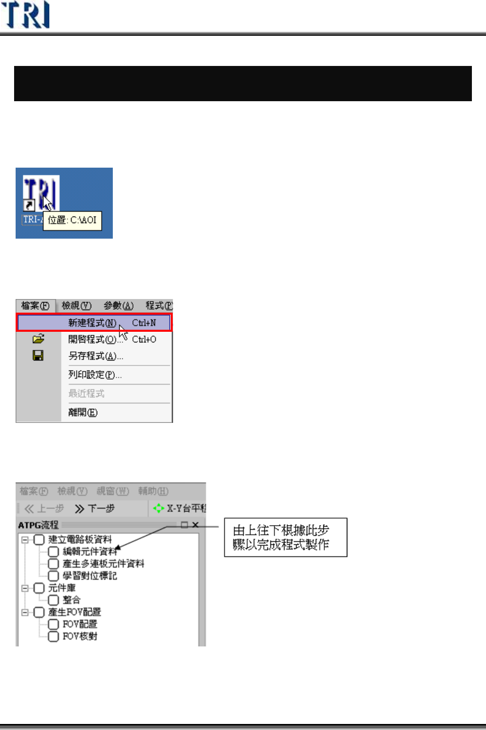 Test Research Inc. 4 TRI 7500 Series User Gu ide – Software 2 程式製作 流 程 2.1 開啟新程式並啟動 ATPG( 自動檢測程式產生器 ) 流 程 1) 對桌面捷徑雙擊 滑 鼠左鍵開啟 AOI 主程式 2) 按下 [ 檔案 / 新建程式 ] 來 建 立 新程式 3) 系統將進入 ATPG 流 程畫面