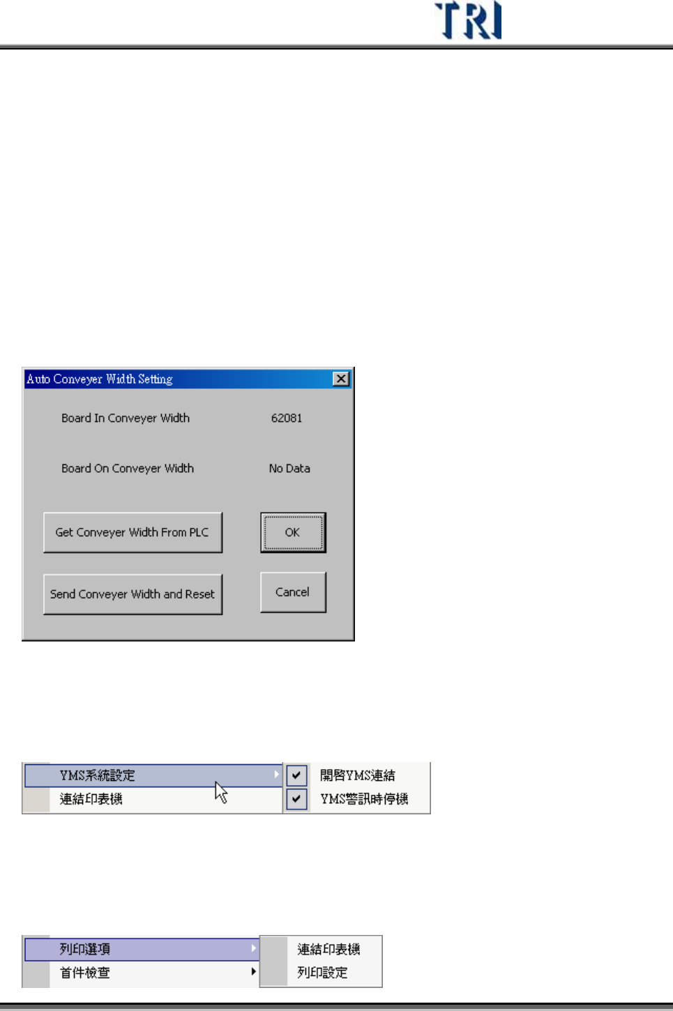 Test Research Inc. TRI 7500 Series User Gu ide – Software 197 3.7.26 自動板寬設定 (A UTO C ONVEYER W IDTH S ETTING ) 可使用本介面自動 讀 取目前的自動板寬值至程式中,或將本程式已儲存的板寬資 料 送至 PLC 以自動調整輸送帶寬 度 。 Board In Conveyer Width – 進板時所…