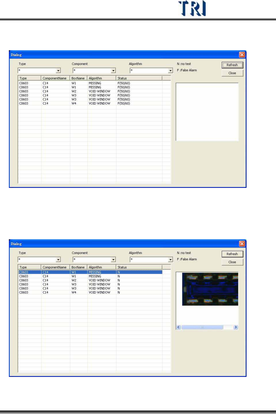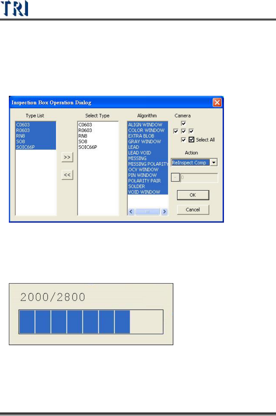 Test Research Inc. 208 TRI 7500 Series User Gu ide – Software B. [Inspection Box Operation] 視窗下啟動此功能 1. 選擇 [Utilities\Inspection Box Operation] 。 2. 出現下圖對話框,則使用者可以選取要執 行 該功能的元件,選取完畢之 後,在 [Action] 欄 位中選取 [ReIn…