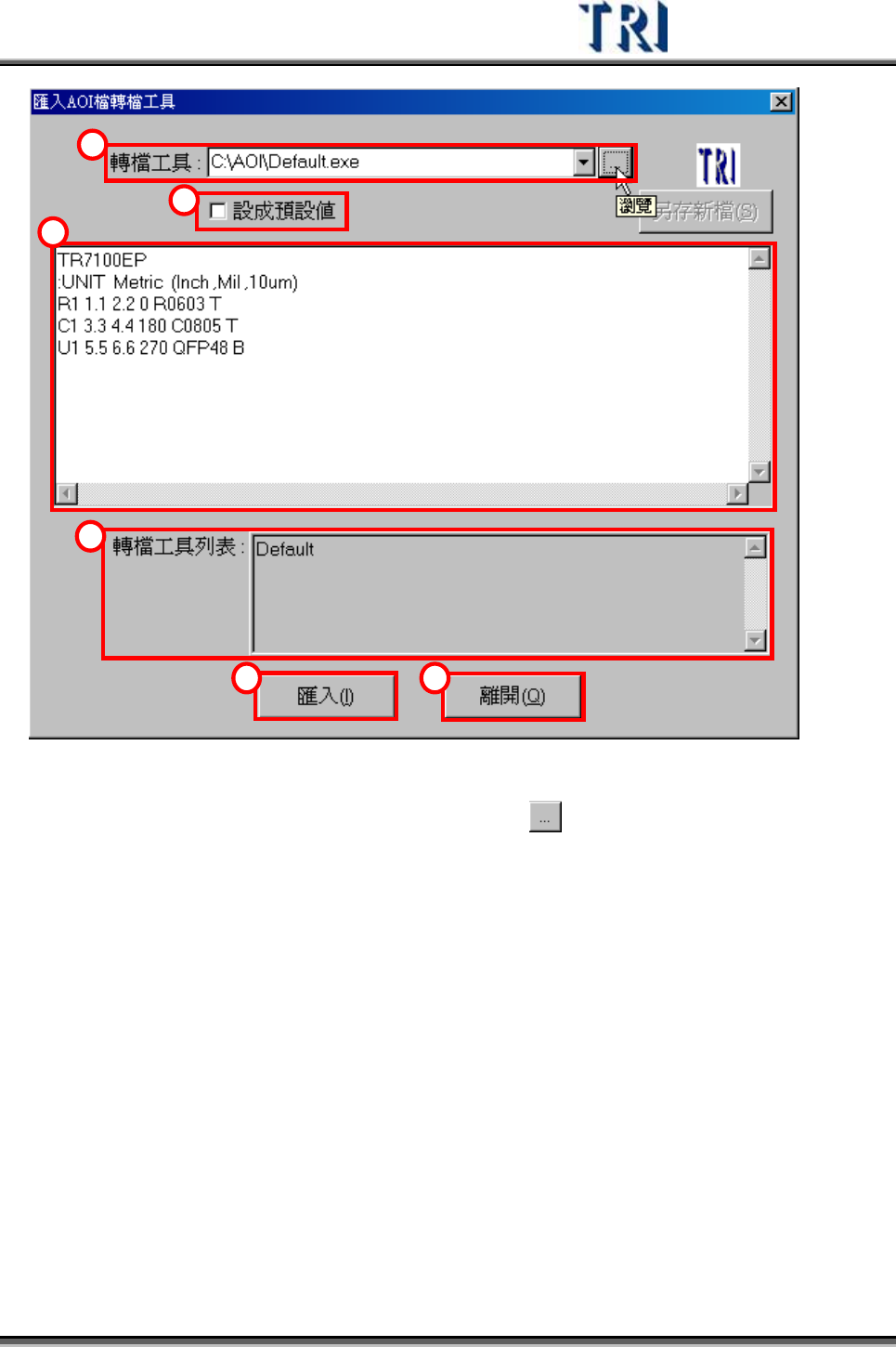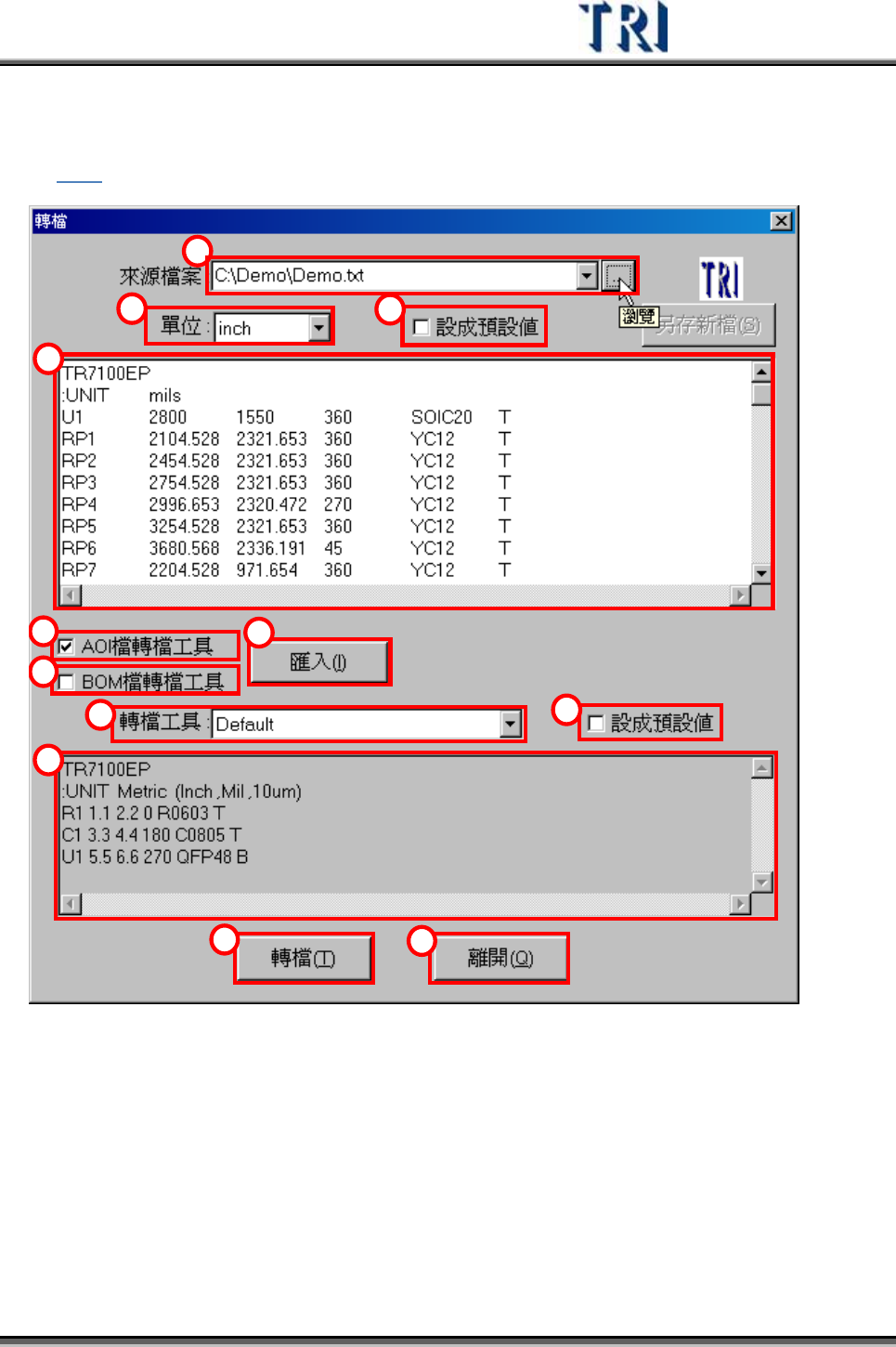 Test Research Inc. 232 TRI 7500 Series User Gu ide – Software 1) 來 源檔案 – 輸入 來 源檔案的 路 徑,或按下 按鈕瀏覽 2) 單位 – 下 拉 式選單選擇 來 源檔案中座標的單位 3) 設成預設值 – 勾選以目前所設定的單位為預設值 4) 來 源訊息視窗 – 將 來 源檔案的內容顯示在此視窗當中 5) AOI 檔轉檔工具 – 若 要轉出的檔案…