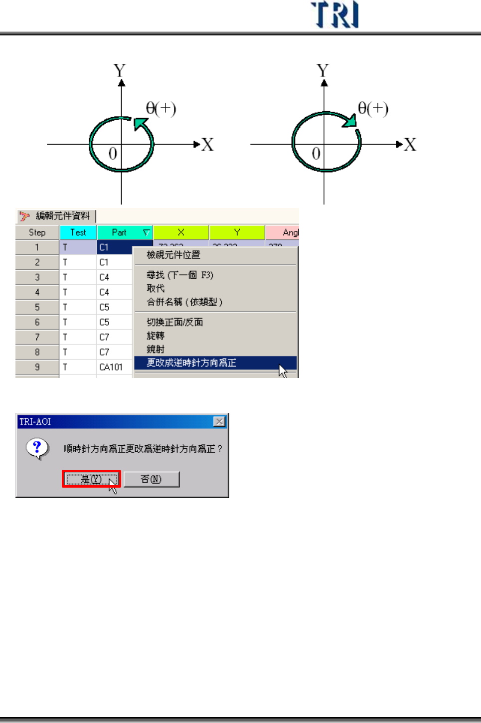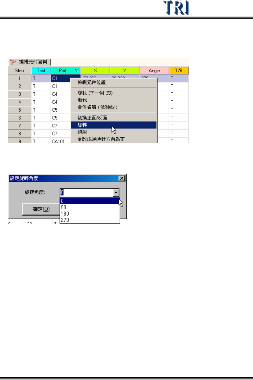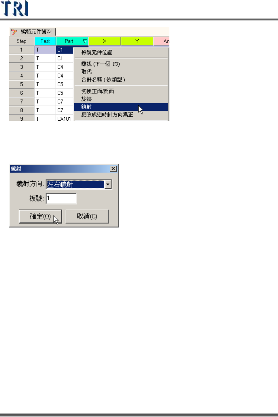 Test Research Inc. 246 TRI 7500 Series User Gu ide – Software 選擇鏡射方向視窗,可選擇 [ 左右鏡射 ] 或 [ 上下鏡射 ] ,同時需選擇欲進 行 鏡射的板號, 選擇後按下 [ 確定 ] 系統即開始進 行 鏡射動作。 鏡射後原先位於正面的元件會被設定至被面,而反面會移至正面,所以鏡射後須注意 正反面是否設定正確。 4.2.8 更 改成逆時針方向為正 …