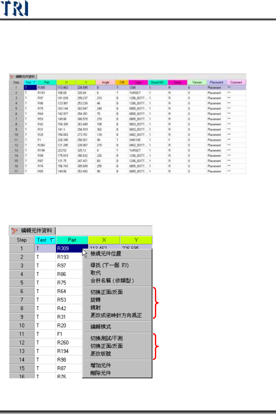 Test Research Inc. 14 TRI 7500 Series User Gu ide – Software 2.3 編輯元件資 料 需將資 料 做編輯,使其符合多 連 板中左上角電 路 板之資訊。 1) 出現元件資 料 表 2) 在元件資 料 表區域按下 滑 鼠右鍵,會出現編輯資 料 表之工具 列 。可 利 用這些工具 將元件資 料 進 行 編輯,直到資 料 符合實際資 料 為止。 若 為待測板為多…